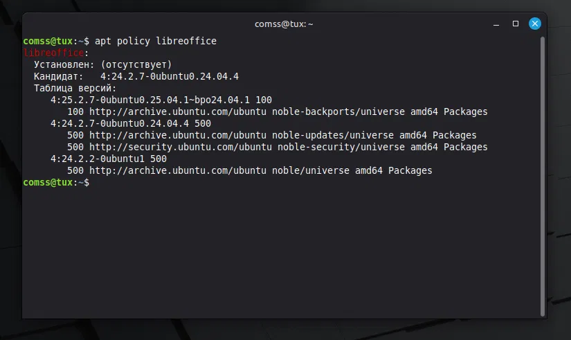 Например, в Kubuntu 24.04 LTS "Noble Numbat" по умолчанию доступен LibreOffice версии 24.2. При наличии доступа к репозиторию noble-backports можно установить LibreOffice 25.2, указав целевой релиз с помощью флага -t или --target-release: