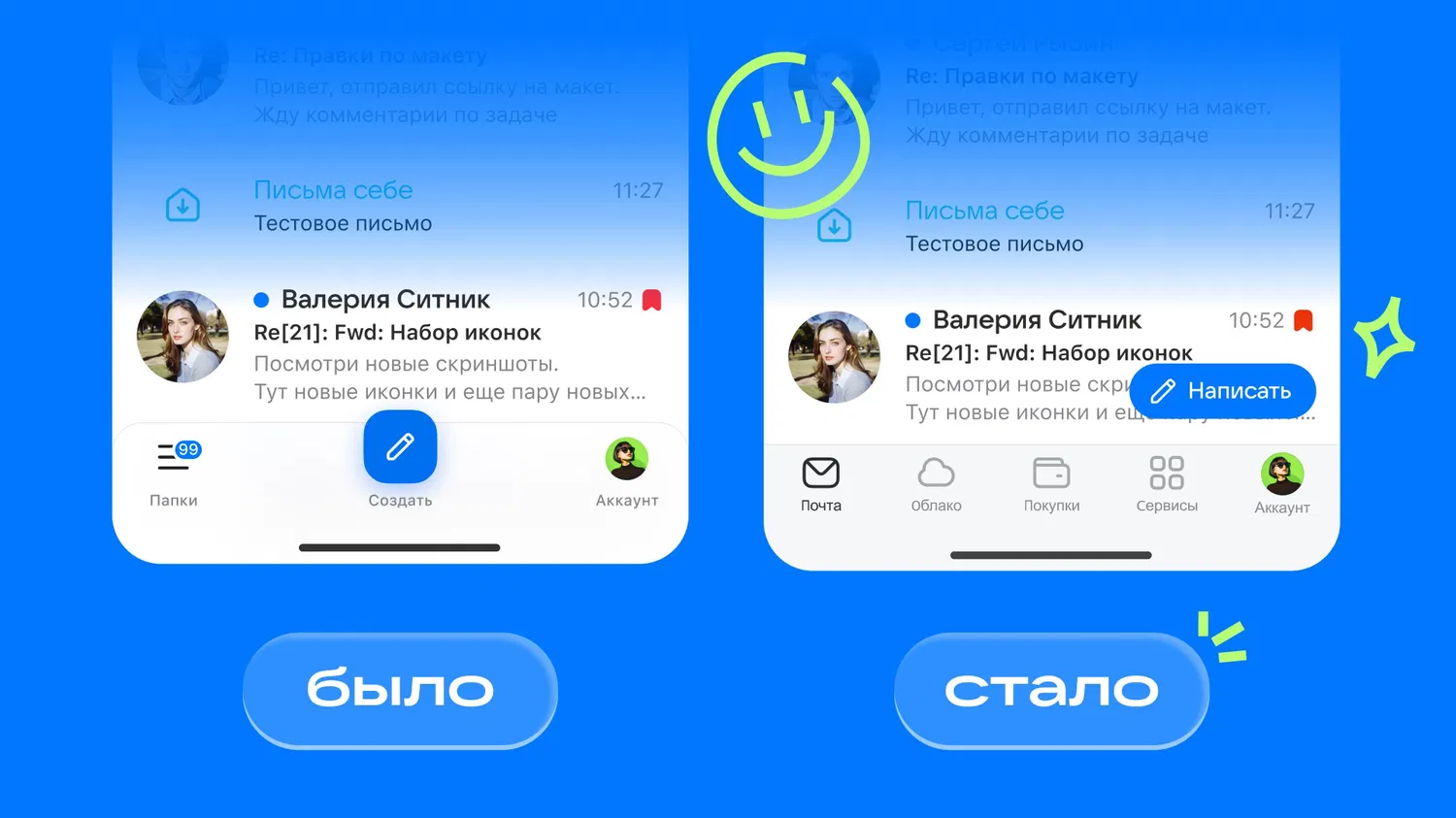 В мобильном приложении Почта Mail.ru для Android и Почта Mail.ru для iPhone появился обновлённый дизайн с переработанной системой навигации. Разработчики сделали интерфейс более компактным и понятным: ключевые сервисы теперь доступны с главного экрана, а навигационная панель переместилась в нижнюю часть приложения.