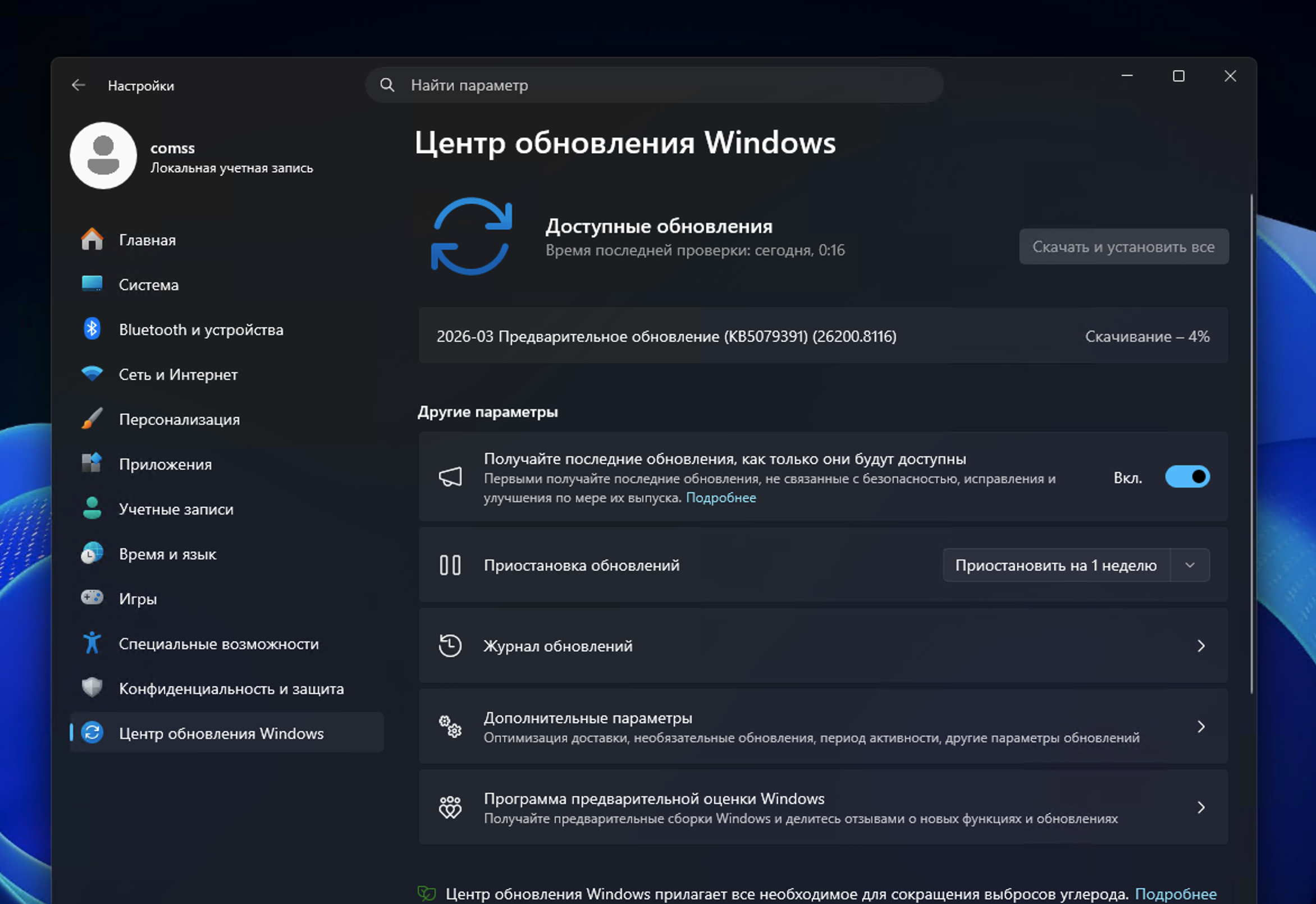 Когда вы увидите, что доступно 2026-03 Предварительное обновление (KB5079391) (26200.8116) нажмите Скачать и установить.
