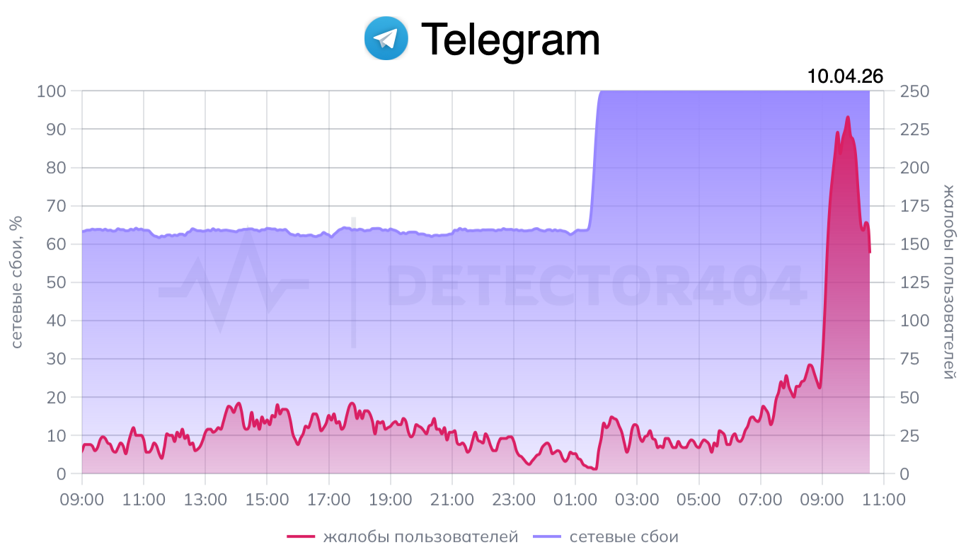 Пользователи мессенджера Telegram в России массово сообщают о резком ухудшении доступа к сервису. По данным мониторинговых платформ, доля неудачных сетевых запросов к мессенджеру достигла 100%, что указывает на фактическую недоступность сервиса для части аудитории.