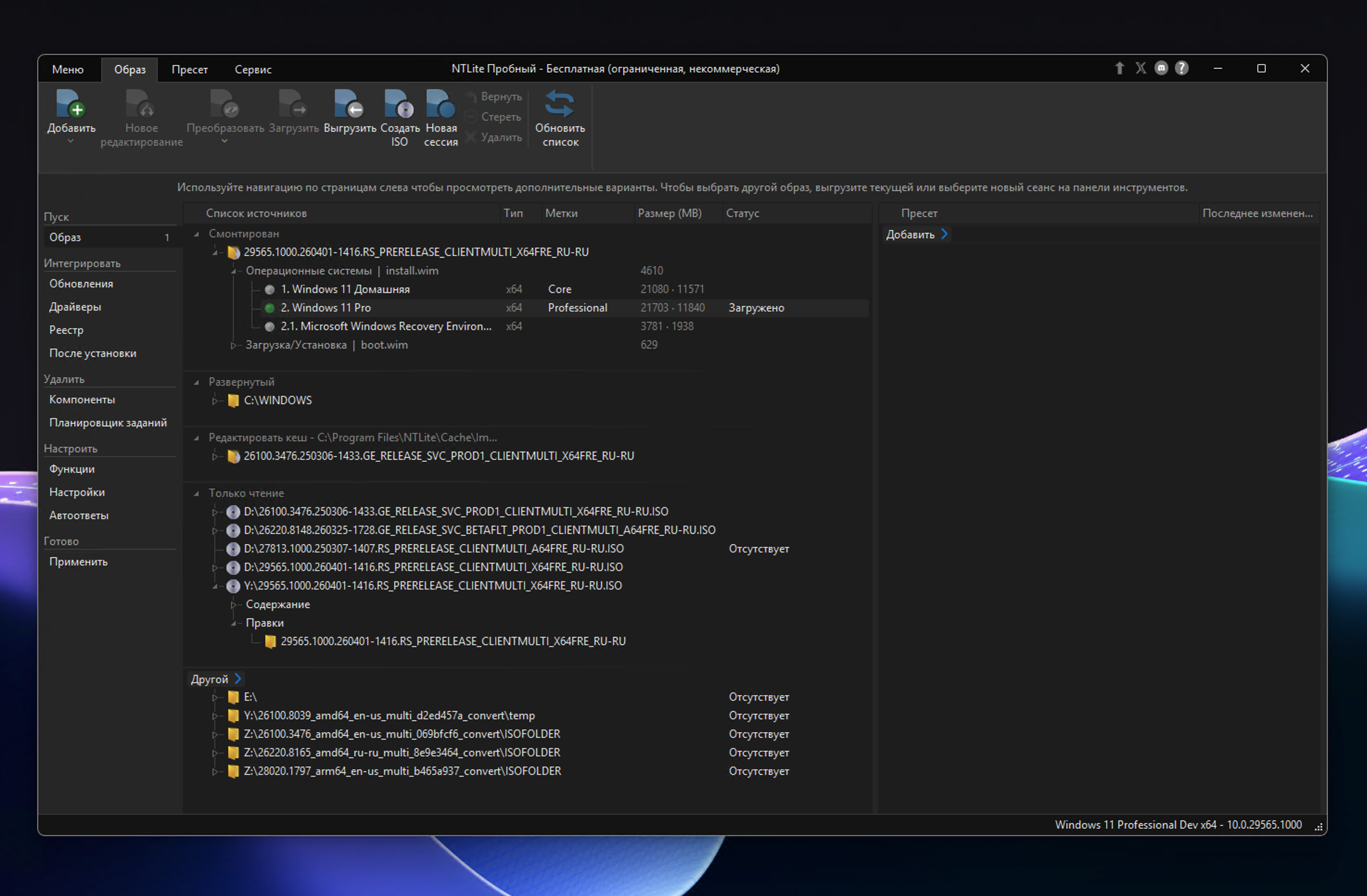 NTLite представляет собой комплексное решение для кастомизации и конфигурации Windows, которое позволяет адаптировать процесс установки и развертывания системы под конкретные задачи. Программа поддерживает основные форматы образов, включая ISO, WIM, ESD и SWM, а также позволяет конвертировать их между собой и создавать загрузочные ISO-образы. Кроме того, NTLite дает возможность редактировать уже установленные системы, внося изменения без необходимости переустановки. Поддерживаются и сценарии автоматической установки с заранее заданными параметрами — учетными записями, разделами диска и другими настройками.