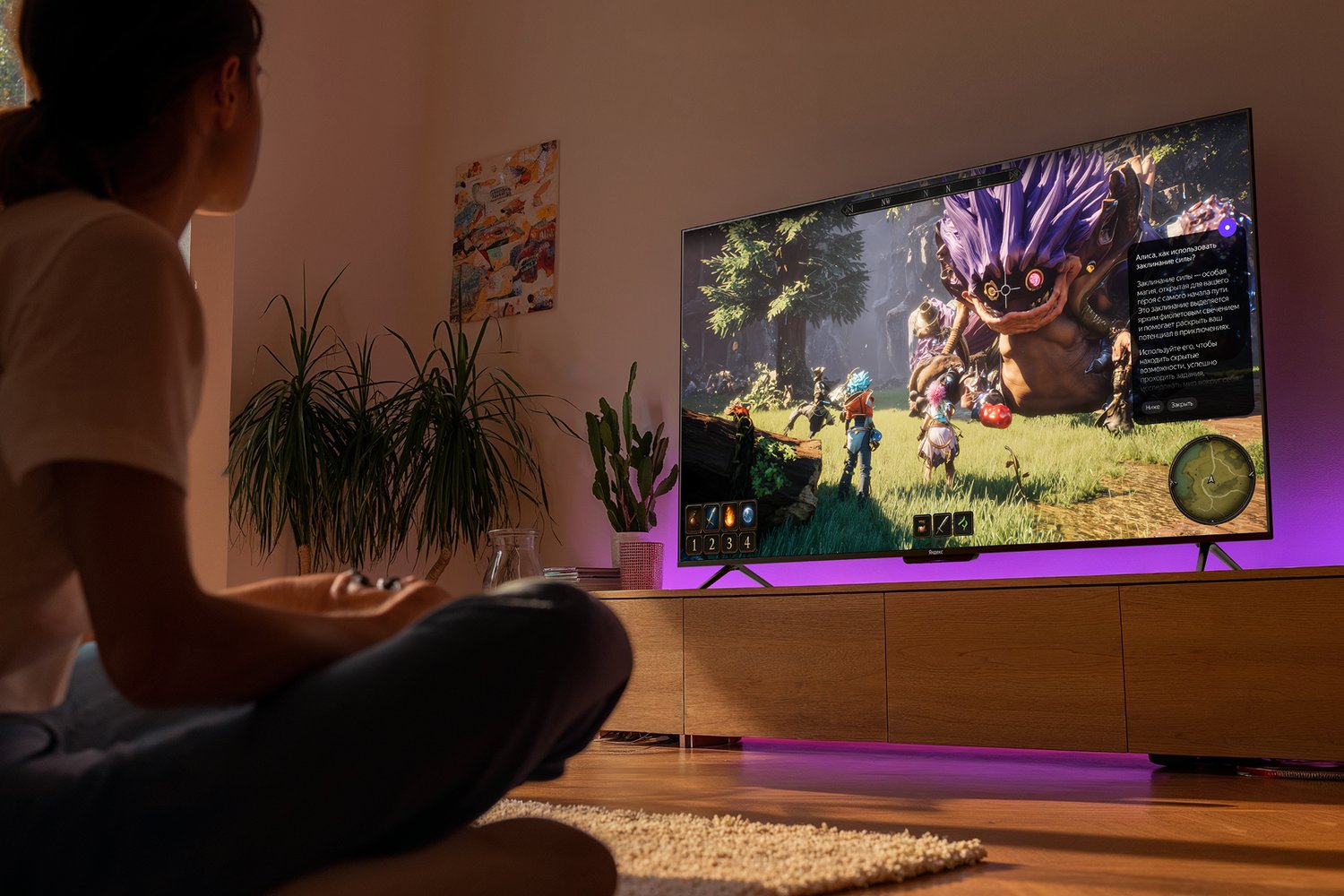 Телевизор ориентирован не только на просмотр видео, но и на игровой сценарий. Во время игры Алиса анализирует происходящее на экране и может давать подсказки, помогая пройти сложные моменты, решить головоломки или победить босса.