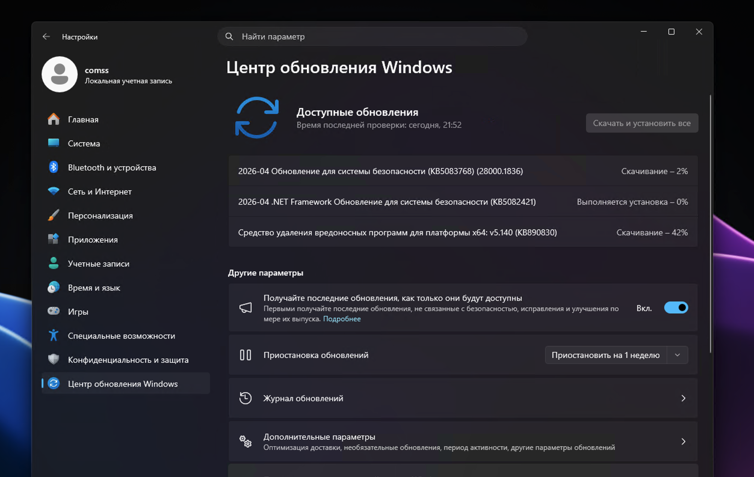 Перейдите в меню Параметры > Центр обновления Windows и нажмите Проверить наличие обновлений. Для завершения установки потребуется перезагрузка компьютера.