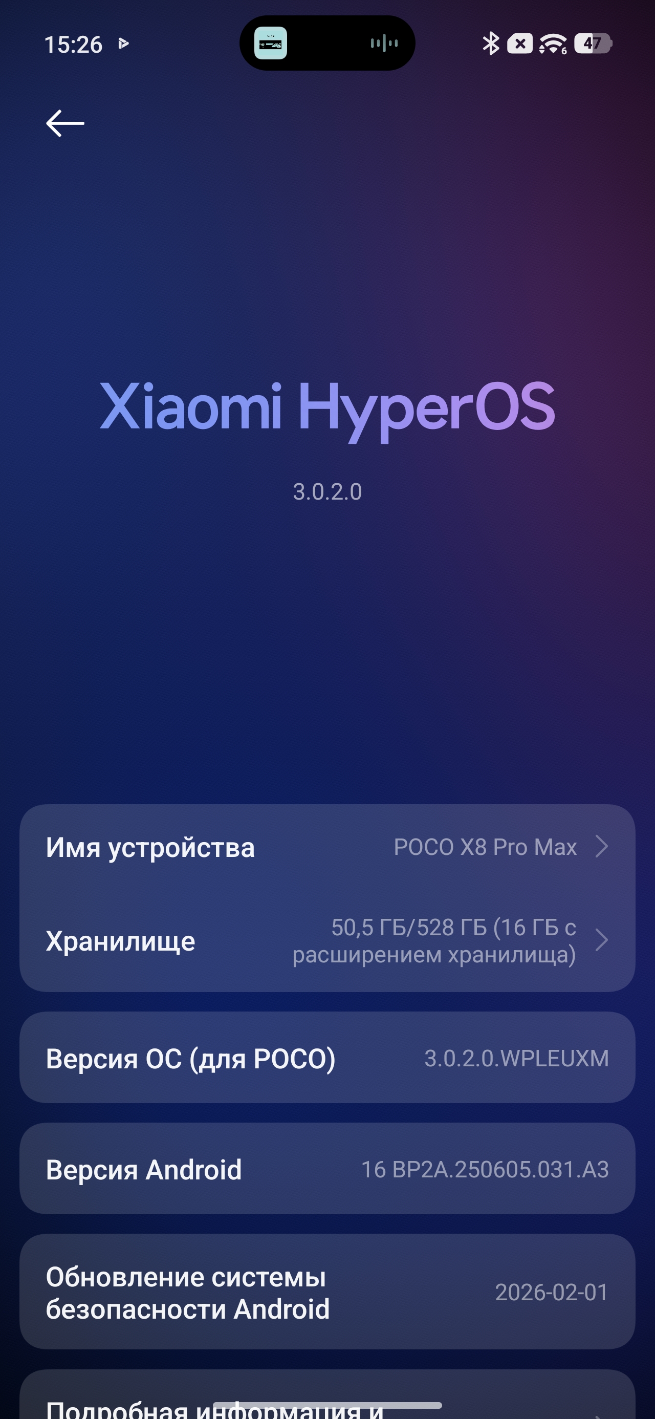 POCO X8 Pro Max работает на HyperOS 3 (версия 3.0.2.0 на момент обзора) поверх Android 16. Xiaomi обещает 4 крупных обновления Android и 6 лет обновлений безопасности — идентично POCO M8 5G.