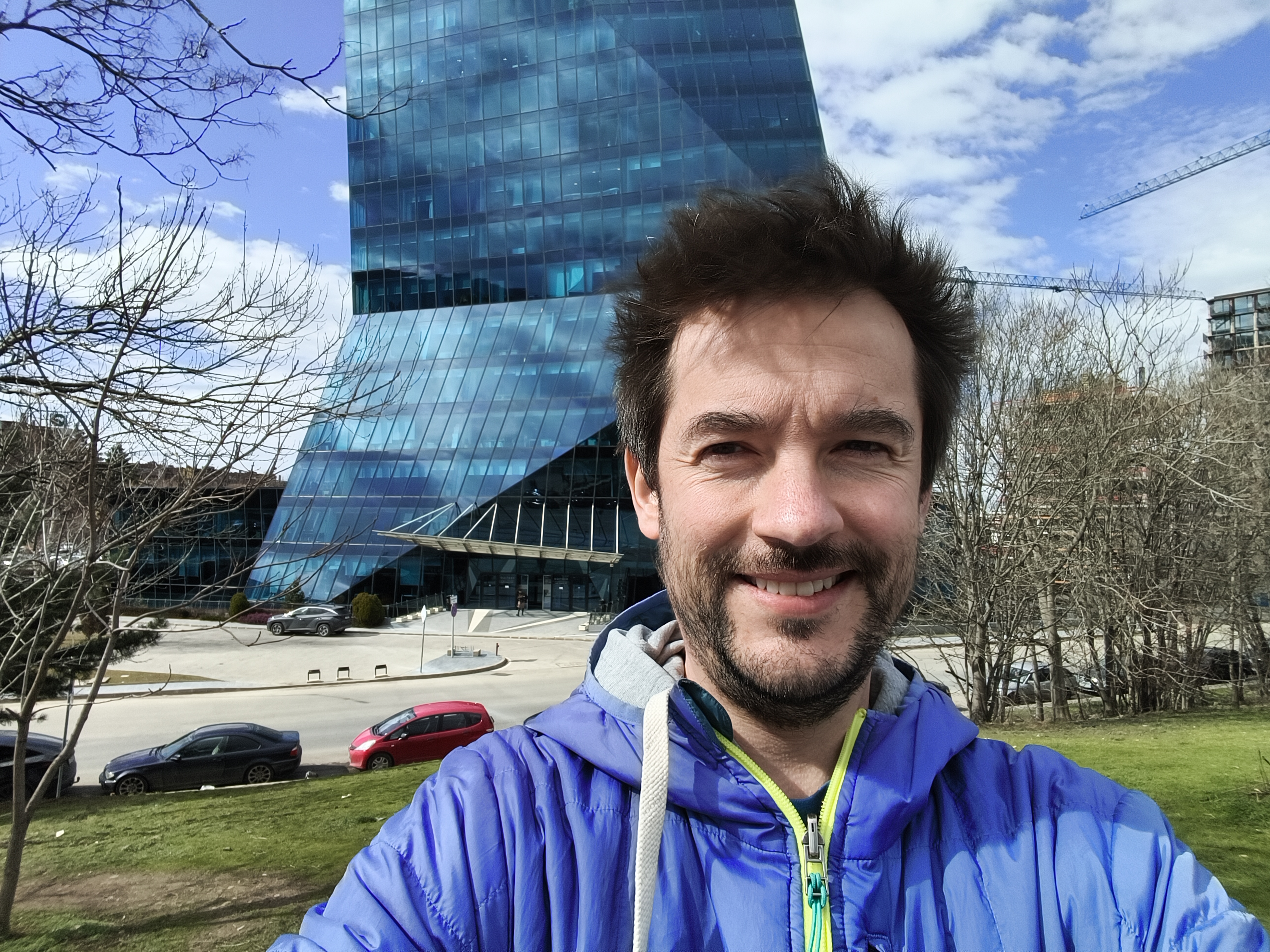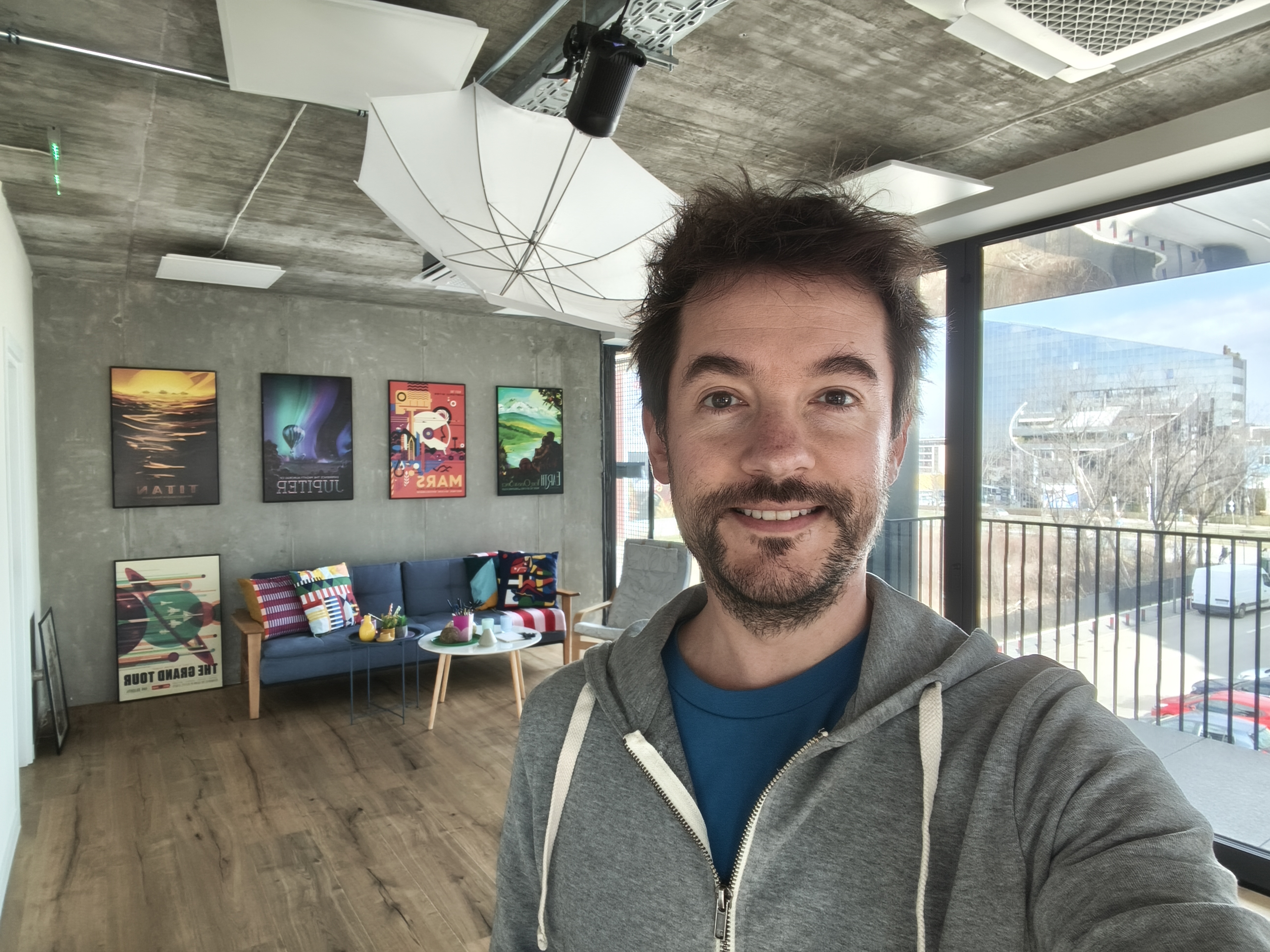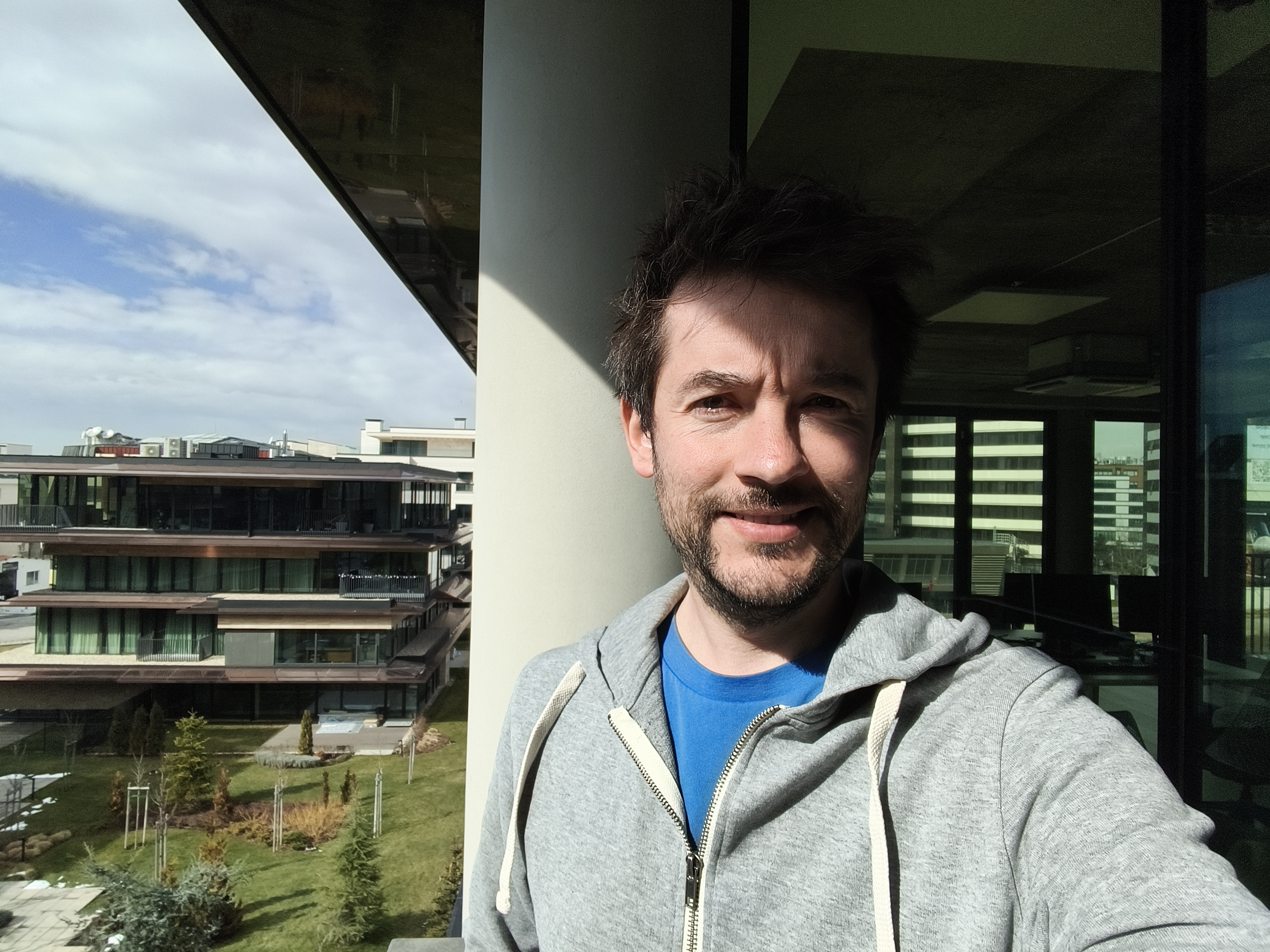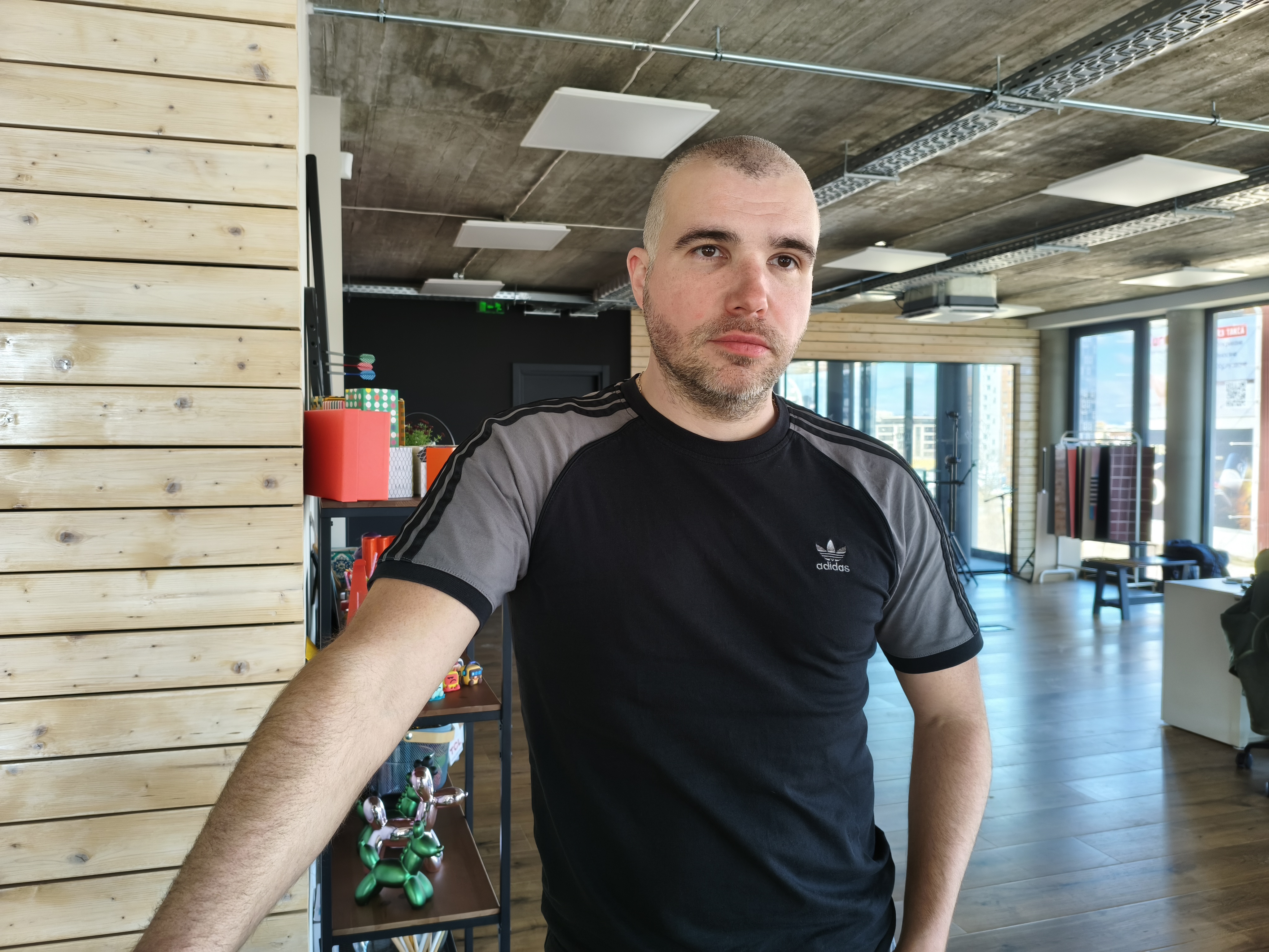 Фронтальная камера 20 МП с более широким объективом (21 мм против 25 мм у прошлых моделей) — заметное улучшение. В кадр помещается больше фона и людей. Детализация адекватная для класса, тона кожи естественные, динамический диапазон широкий. Автофокуса нет, но фиксированный фокус настроен на типичную дистанцию селфи.