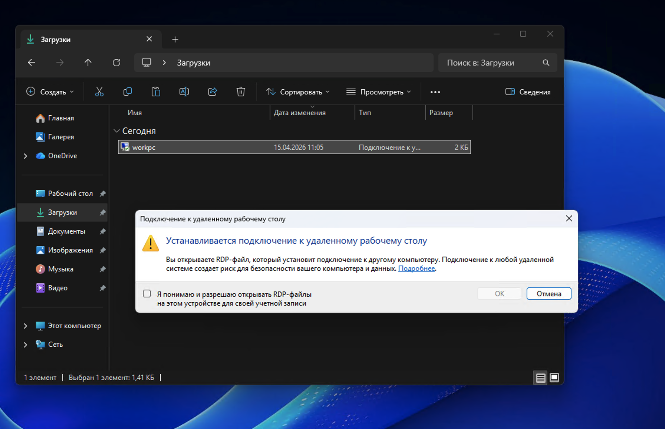 При последующих попытках открыть RDP-файл перед установлением соединения будет отображаться окно безопасности.