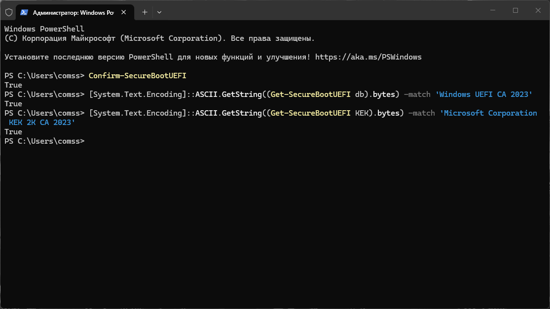 Ответ True означает, что «Безопасная загрузка» активна. Если ответ False или возникает ошибка — Secure Boot отключена в настройках UEFI, и новые сертификаты на устройство не придут, пока вы её не включите. Дальше проверяйте наличие новых сертификатов в активной базе DB: