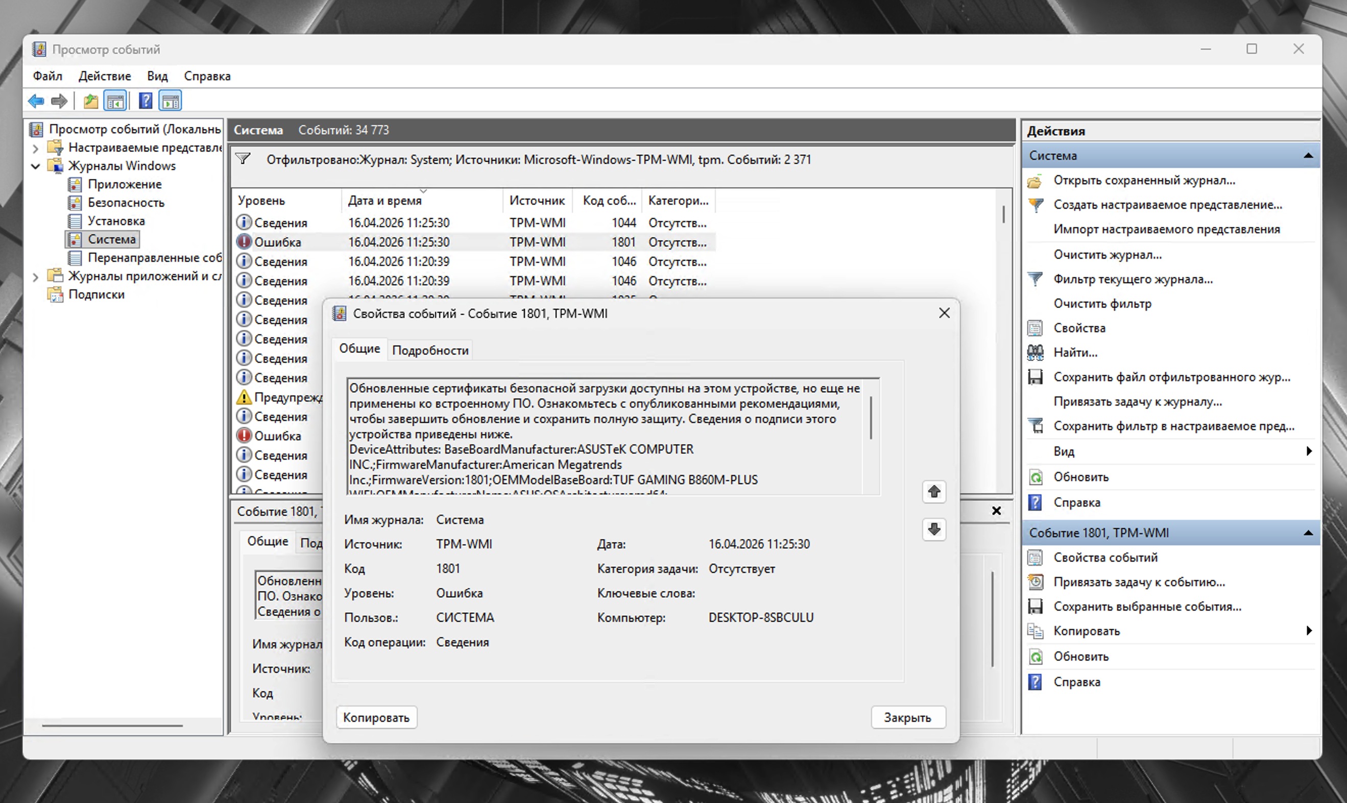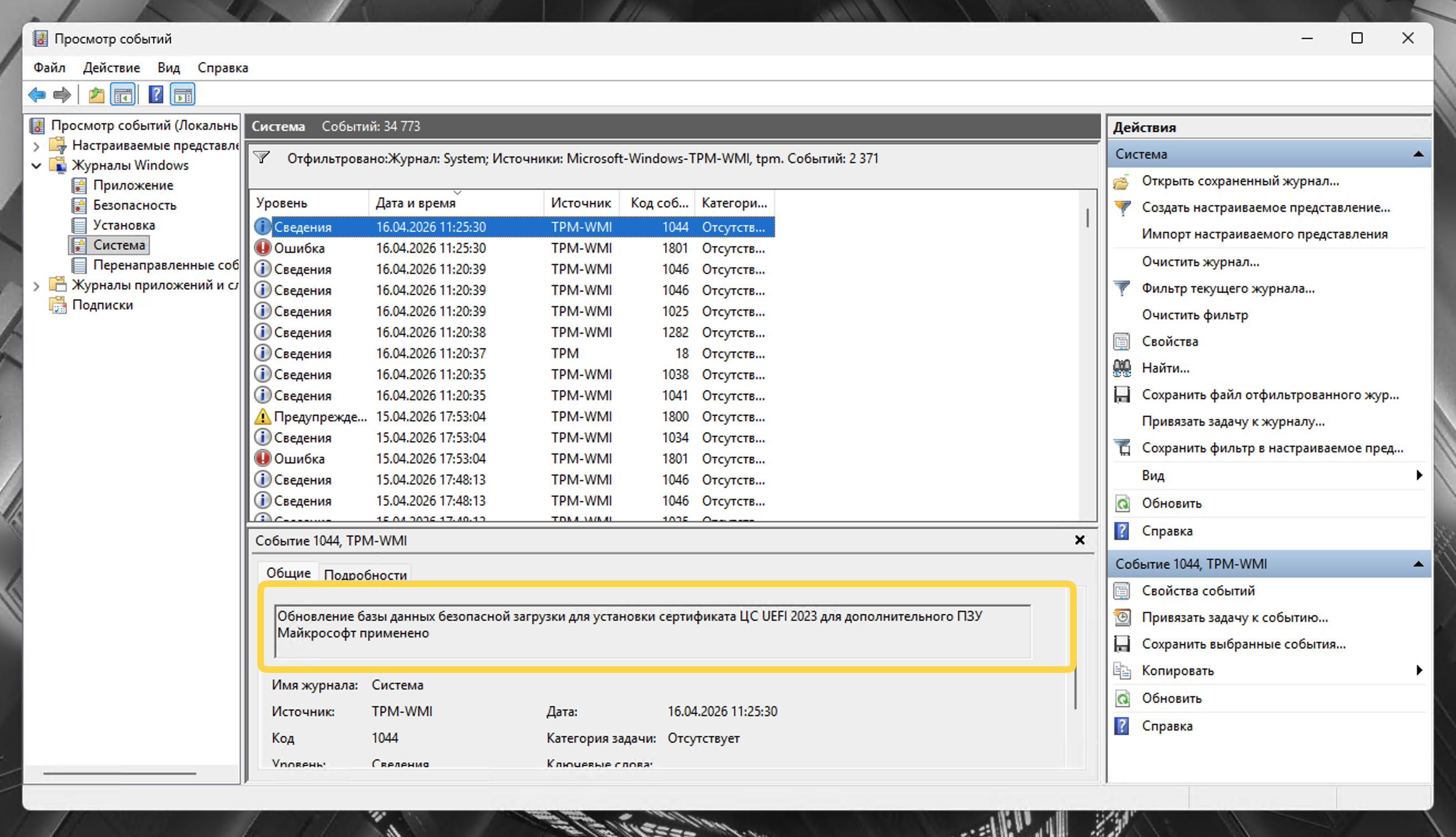 Полезно также заглянуть в «Просмотр событий -> Журналы Windows -> Система» и отфильтровать по источнику TPM-WMI. События с кодом 1801 сообщают, что сертификаты доставлены, но ещё не применены к прошивке — это промежуточное нормальное состояние, нужна перезагрузка.