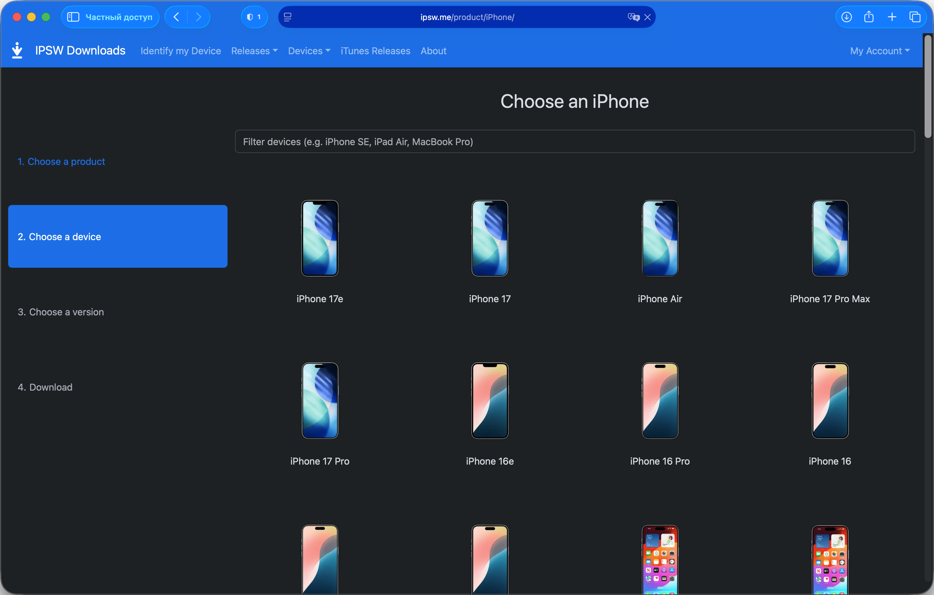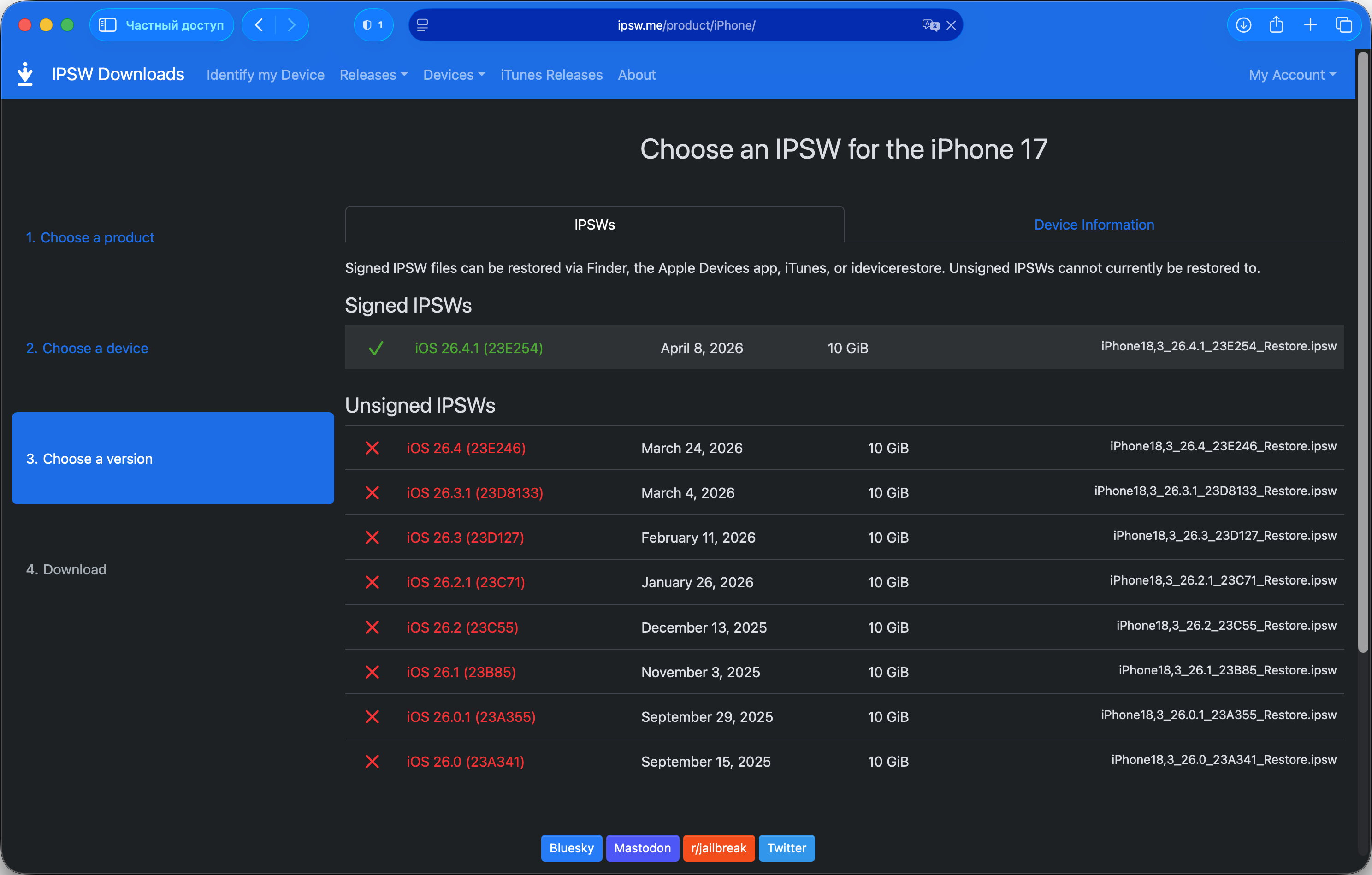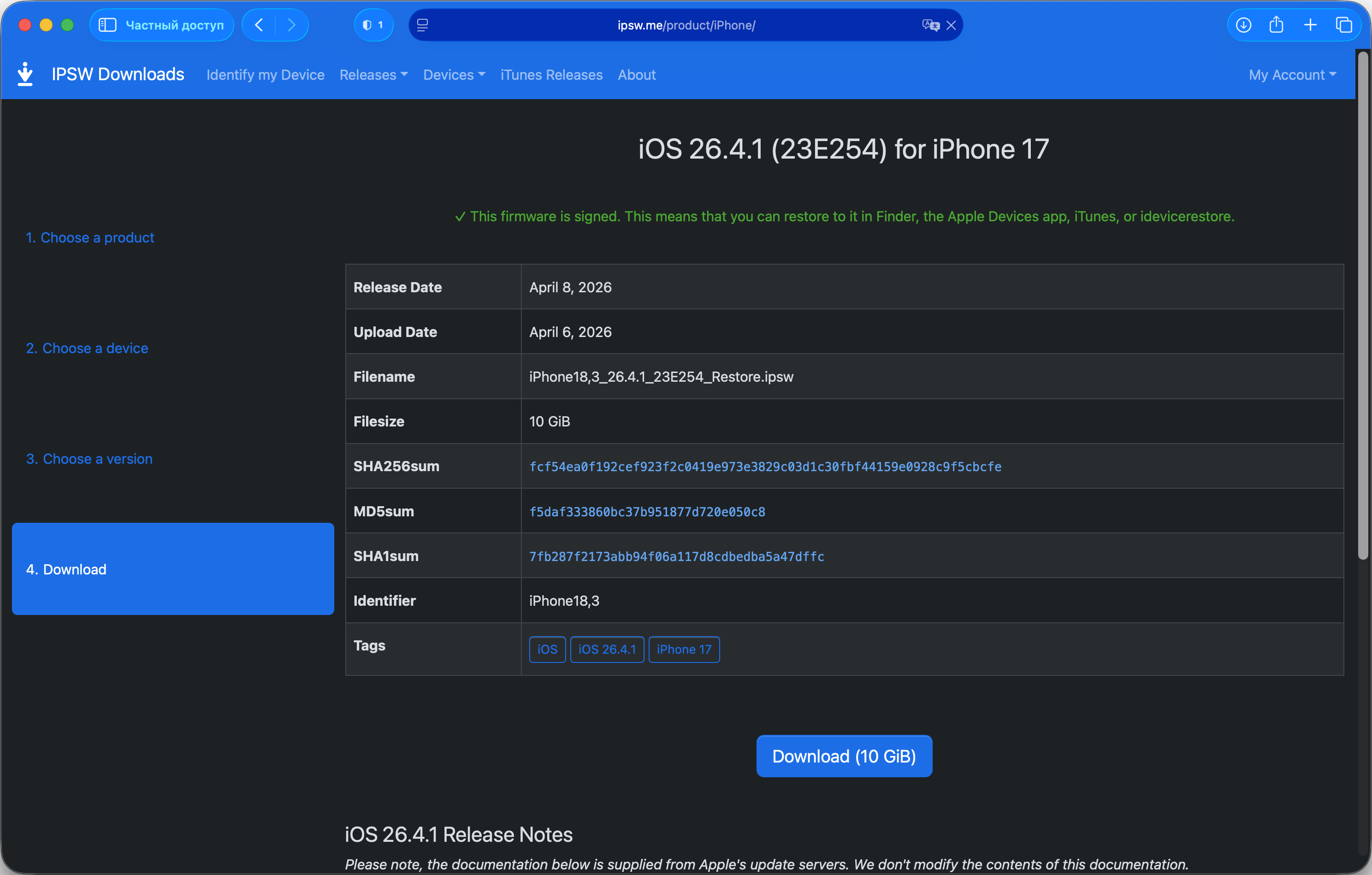 IPSW-файлы можно также скачать вручную с доверенного ресурса ipsw.me, затем в Finder или приложении Устройства Apple зажать Option (macOS) или Shift (Windows) при нажатии на кнопку Обновить и указать путь к файлу. Этот сценарий полностью исключает обращение к серверам Apple в процессе установки – подробная инструкция с пошаговыми скриншотами есть в отдельном руководстве (изначально про бета-версии, но процедура идентична для стабильных сборок).