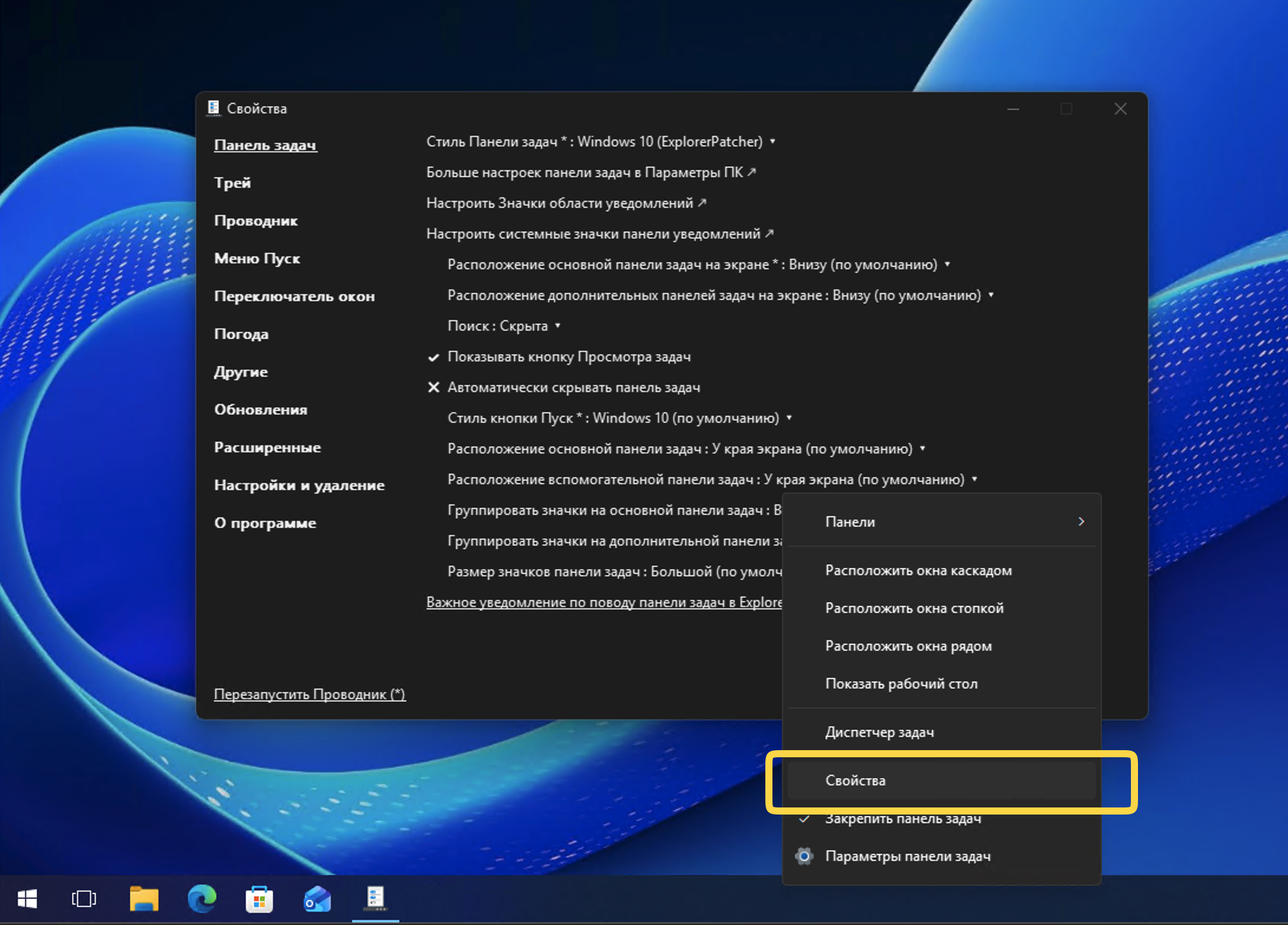 - После установки кликните правой кнопкой мыши по панели задач и выберите Свойства.