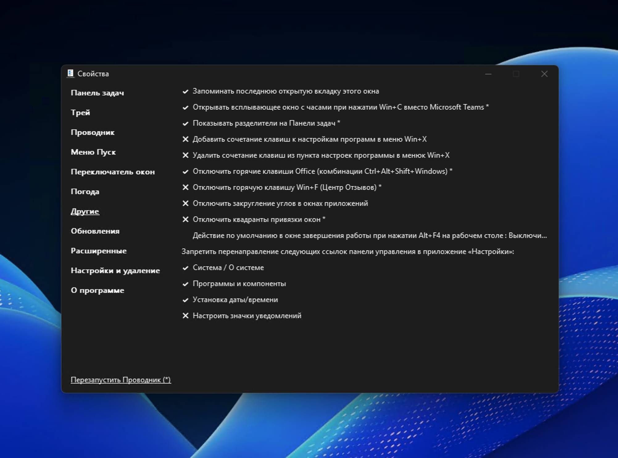 Помимо базовых изменений интерфейса Windows 11, приложение предоставляет более глубокие возможности кастомизации. В частности, доступны улучшенная поддержка панели задач на нескольких мониторах и настройка меню Win+X.