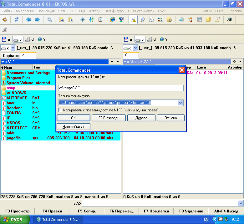 Если CIS установлен на чистую от вредоносных программ систему, можно установить «доверенным» текущее содержимое компьютера. Для этого можно включить режим «Чистый ПК» или же добавить весь системный диск в «доверенные». Следует иметь в виду, что в последнем случае будут подсчитаны и записаны контрольные суммы абсолютно всех файлов. Чтобы ограничиться лишь исполняемыми, можно применить такой трюк (Thanks to Feliks1): через «Total Commander» копируем во временную папку системные каталоги с фильтром по исполняемым и библиотечным файлам, добавляем эту временную папку в «доверенные», а затем, когда контрольные суммы посчитаются (это может занять несколько минут), удаляем ее.