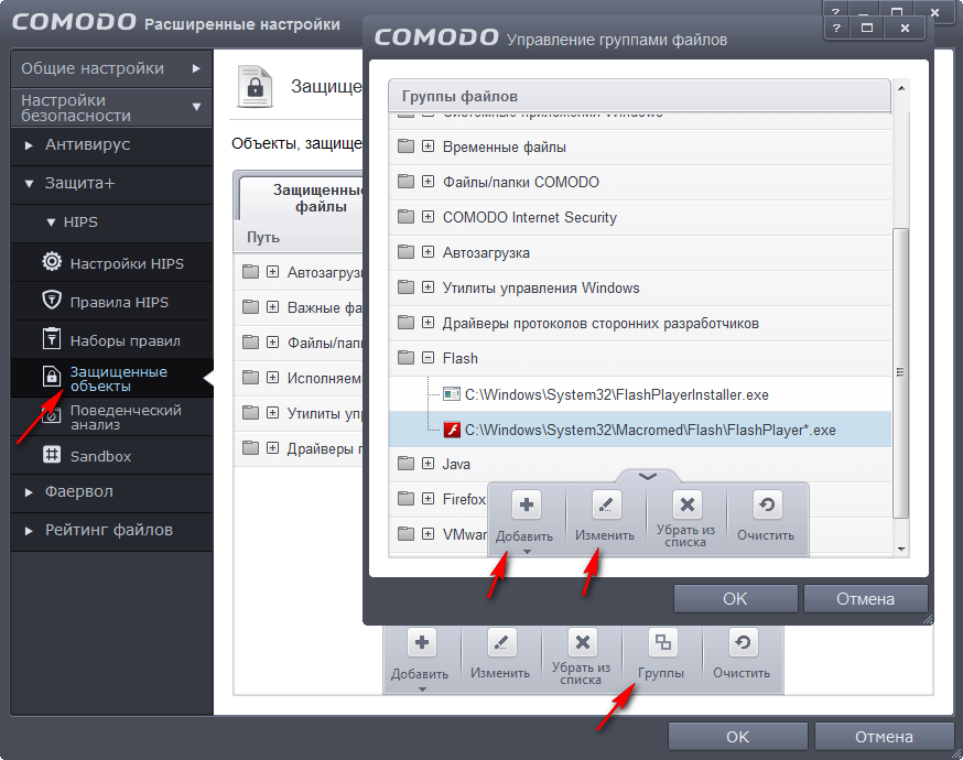 Для создания группы файлов откроем вкладку «Защита+» > «HIPS» > «защищенные объекты» > «Защищенные файлы» и в контекстном меню выберем пункт «Группы». Затем через контекстное меню добавим новую группу и добавим в нее любой файл; станет возможным раскрыть группу и вручную изменить путь к файлу. Можно будет использовать таким образом маски или не существующие на данный момент пути.