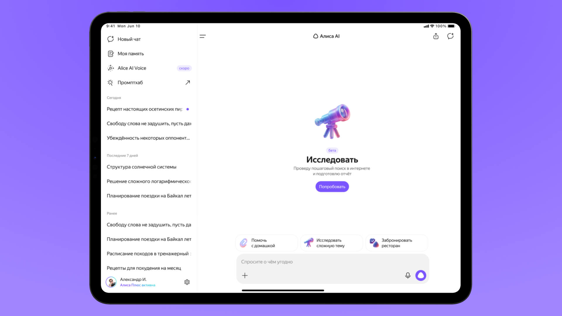 Приложение теперь корректно работает как в вертикальном, так и в горизонтальном режиме. Это делает использование Алисы AI более удобным на устройствах с большим экраном, включая iPad и Android-планшеты.