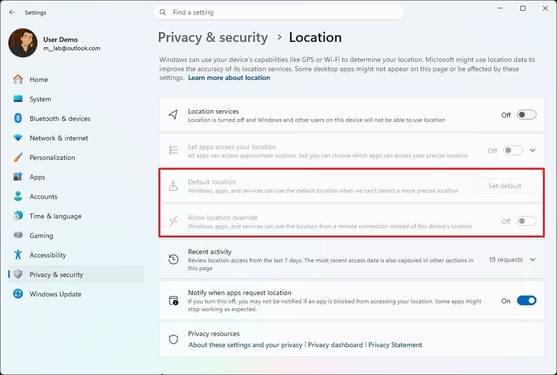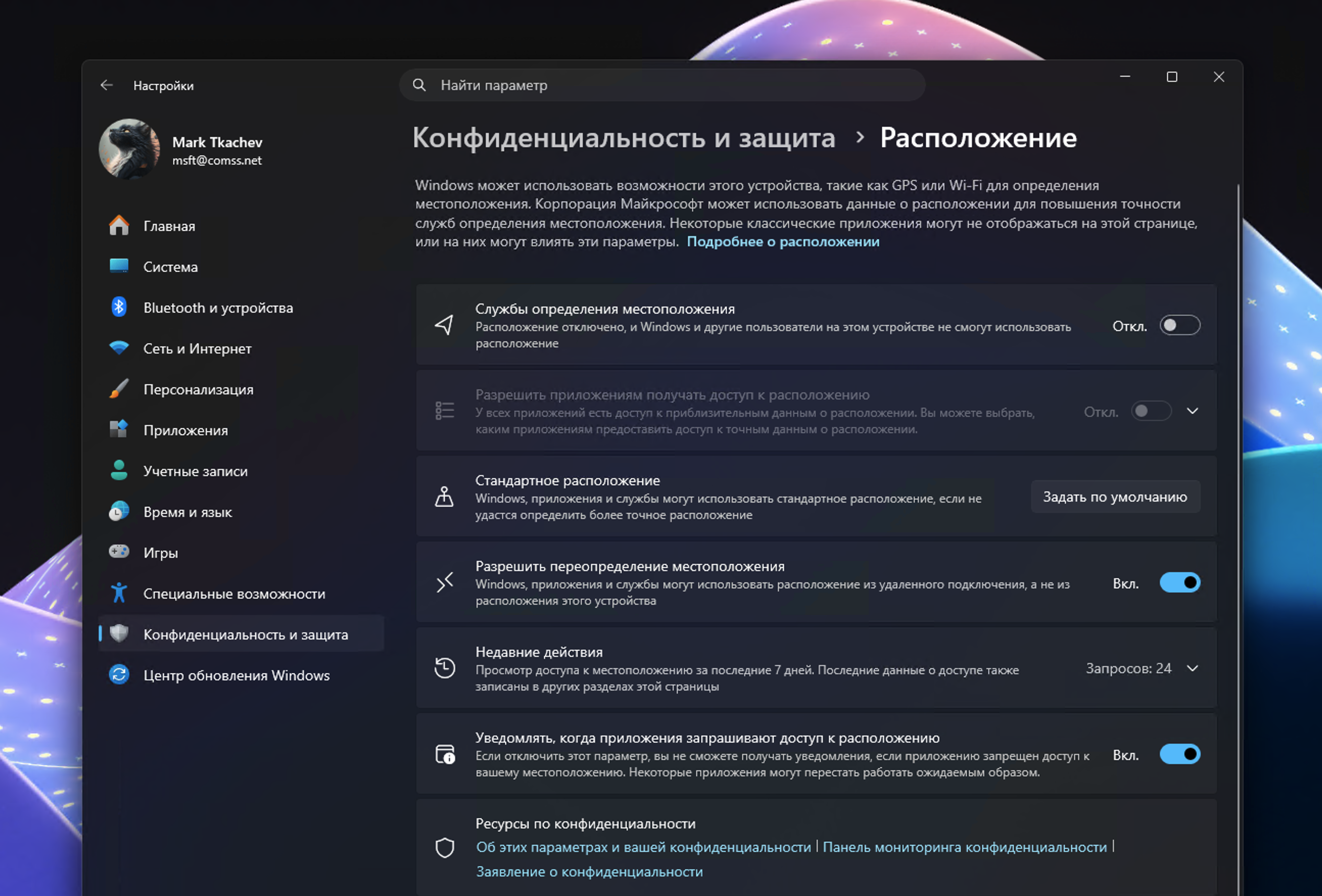 В сборках 26300.8276 и 26220.8271 для Windows 11 обновлено приложение «Параметры». Теперь опции «Стандартное расположение» и «Разрешить переопределение местоположения» становятся недоступными, если опция «Службы определения местоположения» отключена (Параметры > Конфиденциальность и защита > Расположение).
