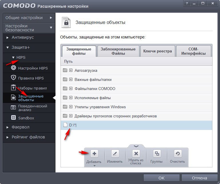 При ограничении доступа программ к различным ресурсам HIPS опирается на данные раздела «Защищенные объекты». Например, файл или каталог может быть защищен от модификации, только если его полное имя подходит под какую-либо из масок на вкладке «Защищенные файлы». Так, если требуется запретить какой-либо программе изменение файлов на диске «D:» (независимо от их типа), необходимо сначала занести этот диск в список защищенных.