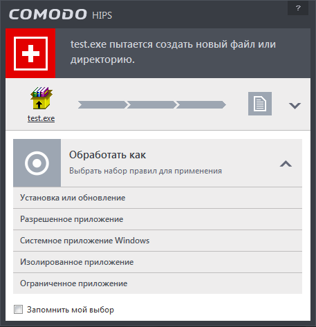 Когда возникает оповещение HIPS относительно активности какого-либо приложения, можно в окне этого оповещения выбрать желаемую политику, с запоминанием или без него.