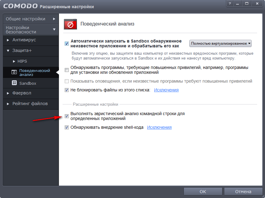 Опция рядом с «эвристическим анализом командной строки» включает обнаружение внедрения shell-кода. Обычно рекомендуется добавлять здесь в исключения каталог программы VMware Player/Workstation, программу Alcohol.