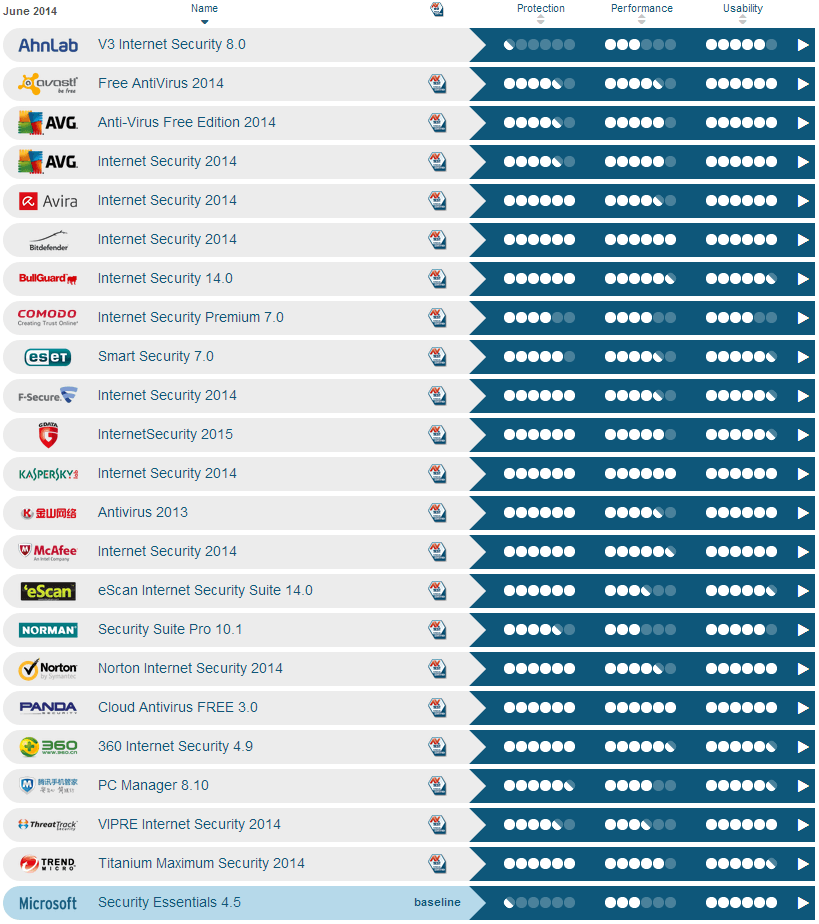 В мае и июне 2014 года независимая лаборатория AV-Test оценила 23 антивирусных решений для домашних пользователей - бесплатные антивирусы и программы Internet Security. Для тестирования использовалась операционная система Windows XP (SP3). Настройки антивирусов были установлены по умолчанию.