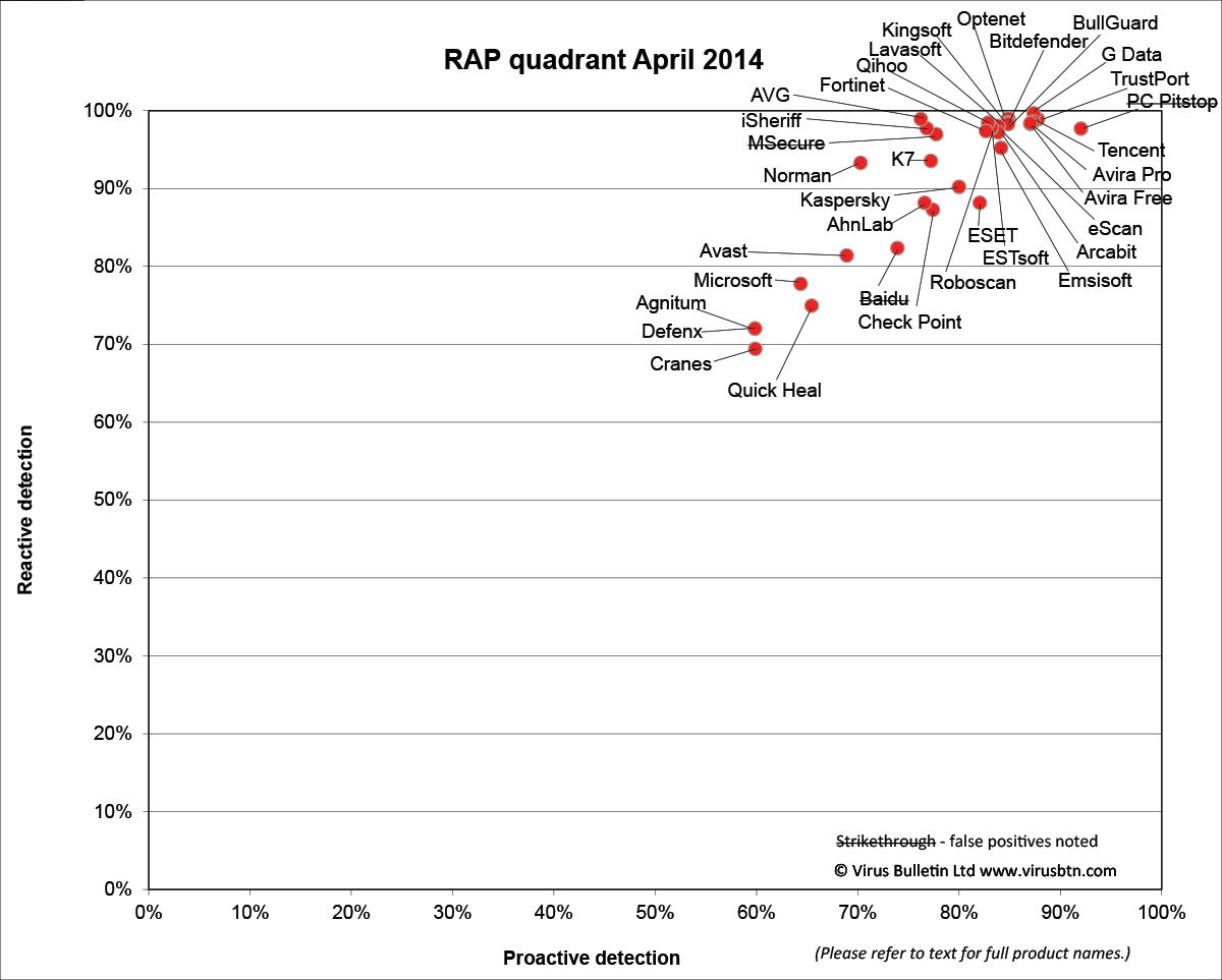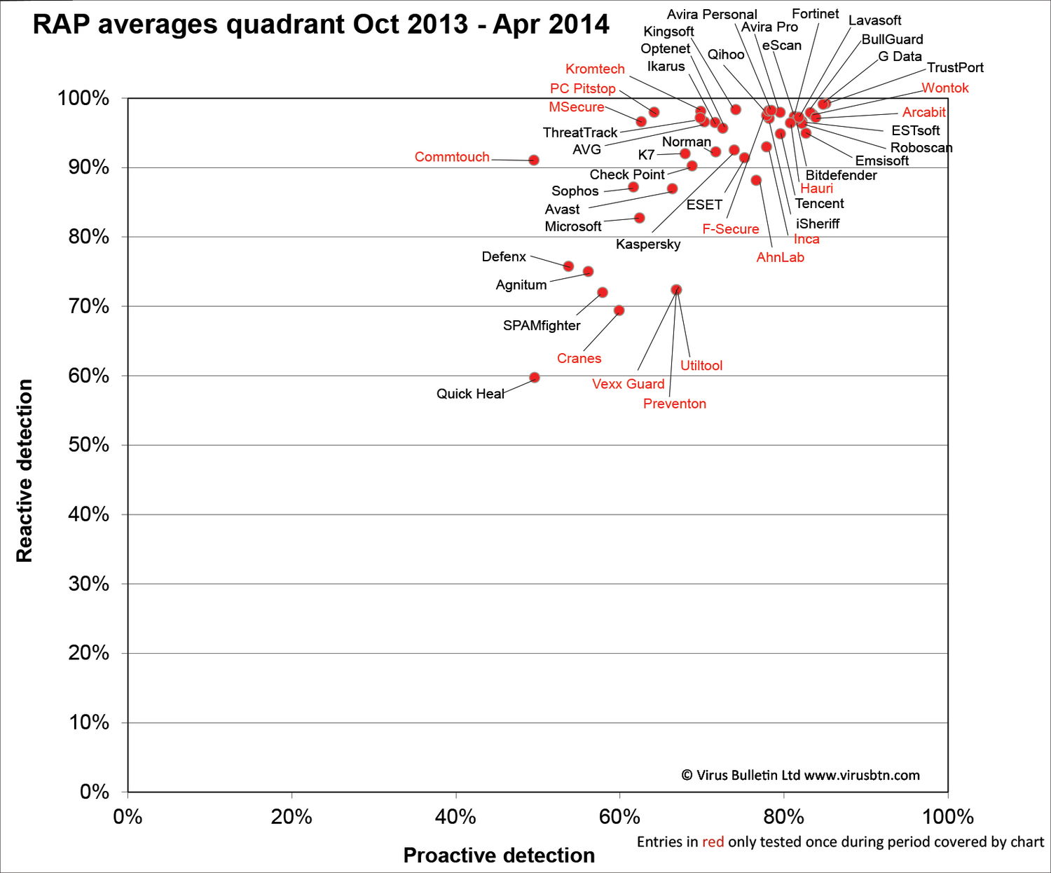 Эксперты Virus Bulletin оценивали способность антивирусных решений ведущих вендоров обнаруживать и блокировать вредоносные программы, занесенные в список WildList по состоянию на апрель 2014 года. Данный список содержит информацию обо всех известных вирусах, которые были широко распространены в Интернете на этот момент времени.