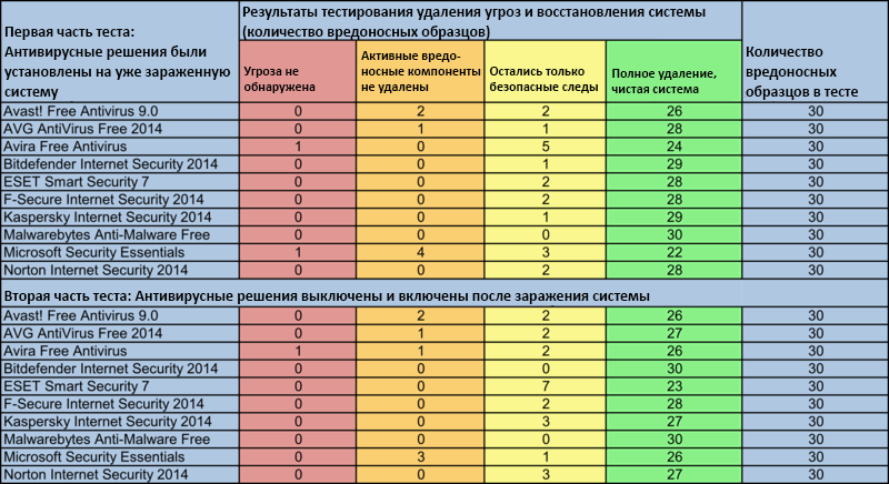 Общий результат: Большинство антивирусных решений показали отличные результаты в тесте на восстановления. Некоторые из них оставляли небольшой цифровой "мусор", но в нем не было ничего опасного (Тестирование AV-Test от 9/13 до 6/14).