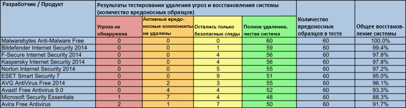 Среди всех протестированных решений, только бесплатный продукт Malwarebytes Anti-Malware Free смогл полностью очистить и восстановить систему во всех 60 тестах.