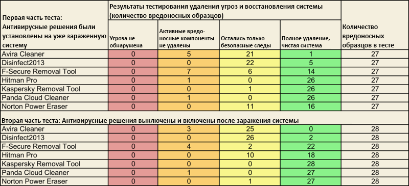 Результаты тестирования обеих тестовых групп (антивирусных программ и инструментов очистки/восстановления) были внесены в таблицу согласно следующей схеме обработки угроз: