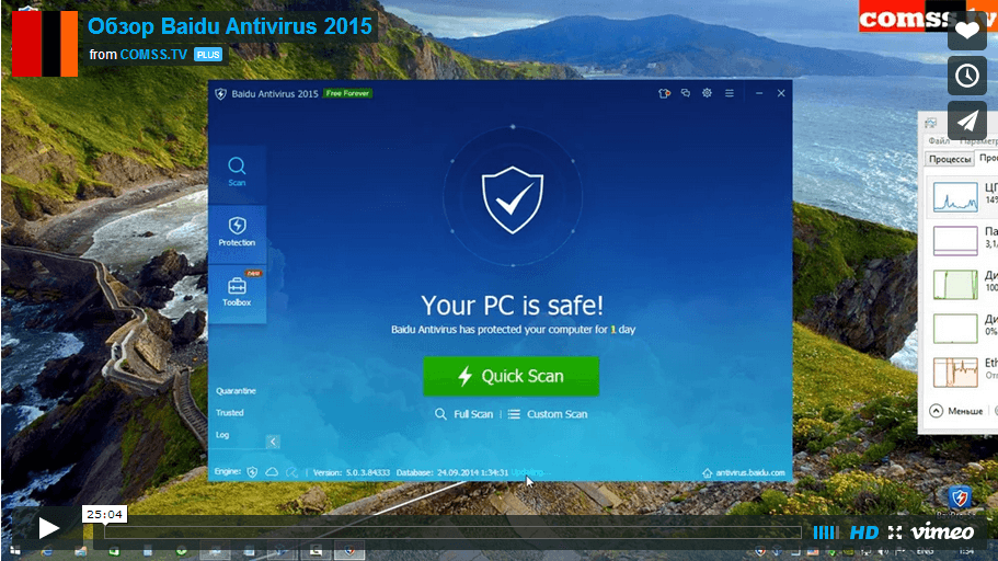 Baidu Antivirus 2015 - бесплатный антивирус, который включает защиту от фишинга, опасных веб-сайтов и вредоносных загрузок, защиту от перехвата клавиатуры, захвата экрана и веб-камеры, а также проактивную защиту HIPS от неизвестных угроз.