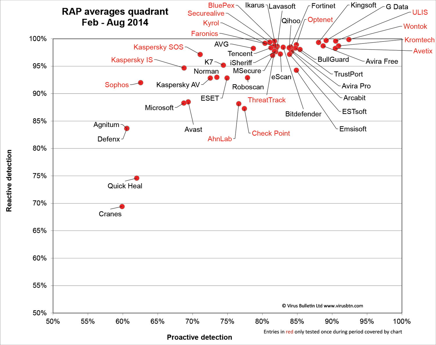 Красным отмечены названия антивирусов, которые тестировались за этот период только один раз.