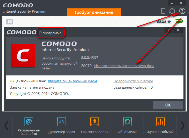 Для ручного офлайн-обновления антивируса следует в главном окне CIS нажать значок справки, выбрать пункт «О программе», затем «Импортировать антивирусную базу» и указать путь к файлу с базой. Этот файл можно скачать непосредственно или скачать в запакованном виде по ссылке на странице официального форума.