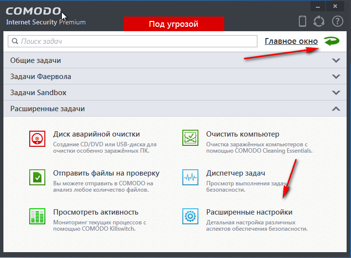 Можно настроить набор кнопок, расположенных в нижней части главного окна, называемой «Панель задач»: перейти в окно «Задачи» и добавить необходимые кнопки через контекстное меню, а затем упорядочить их перетаскиванием. Дополнительно все элементы, добавленные на панель задач, можно сделать доступными через меню «Пуск». Для этого следует закрепить в меню «Пуск» файл cis.exe из каталога CIS — в результате избранные задачи появятся в раскрывающемся подменю «COMODO Internet Security».