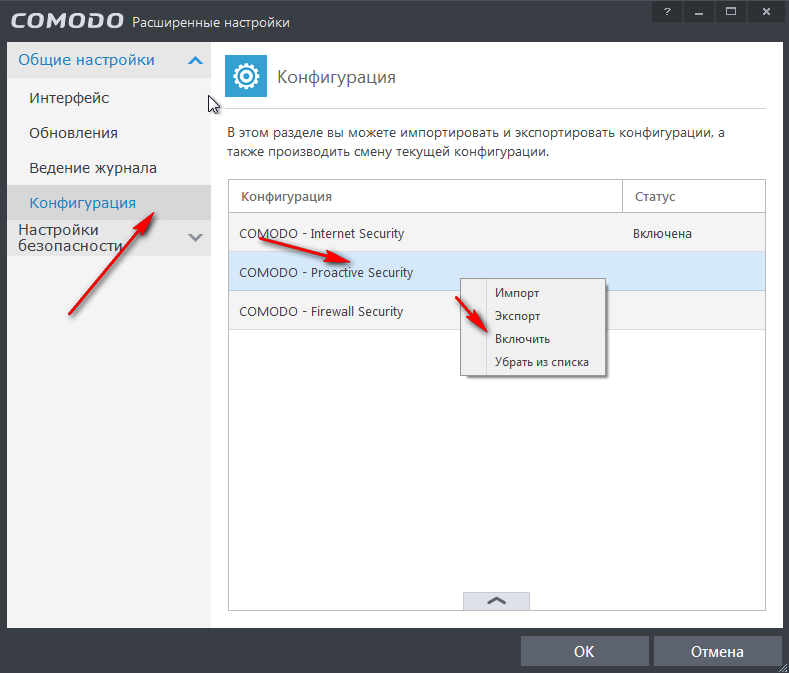 Прежде чем переходить к настройке, следует определиться с выбором исходной конфигурации. Список имеющихся конфигураций находится в разделе «Общей настройки» на вкладке «Конфигурация». По умолчанию используется конфигурация «COMODO - Internet Security». Однако для наиболее эффективной защиты настоятельно рекомендуется включить конфигурацию «COMODO - Proactive Security».