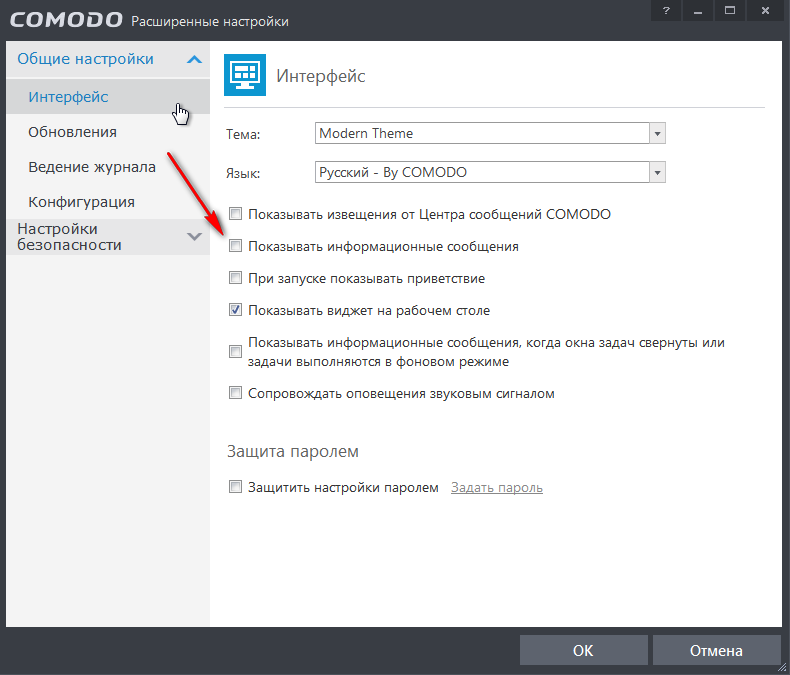 Рассмотрим вкладку «Интерфейс» в окне расширенной настройки. Опции «Показывать извещения от центра сообщений COMODO», «При запуске показывать приветствие» и «Показывать кнопку "Улучшить" в главном окне» имеют рекламное назначение, отключим их. Выбор остальных опций зависит от вкуса и потребностей пользователя.