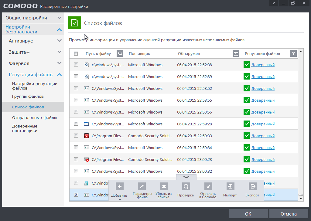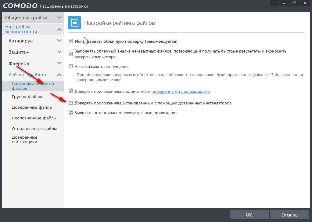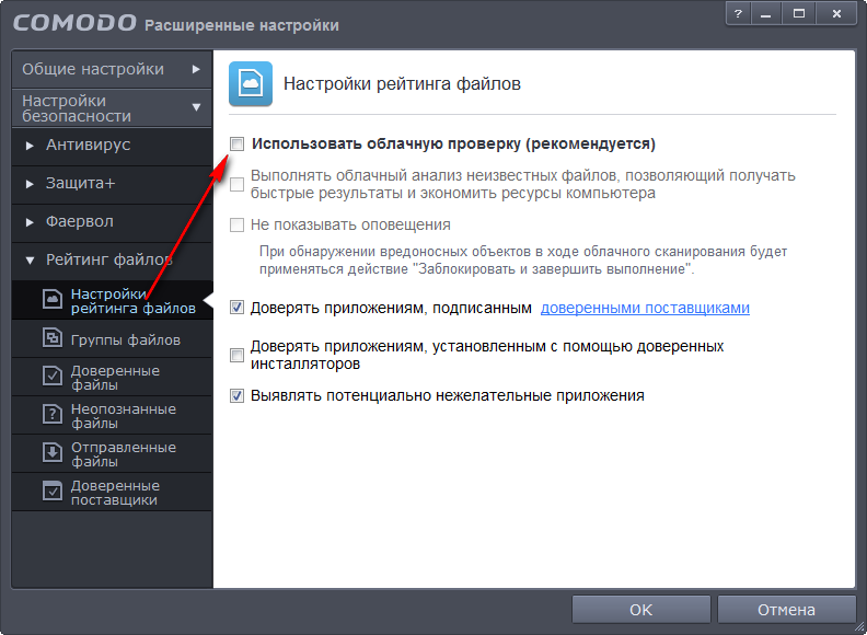 Если на вкладке «Настройка рейтинга файлов» отмечена опция «Использовать облачную проверку», то контрольные суммы файлов сверяются с облачной базой Comodo. В результате проверки новый файл может автоматически занестись в доверенные, а также его поставщик может добавиться в список доверенных поставщиков.