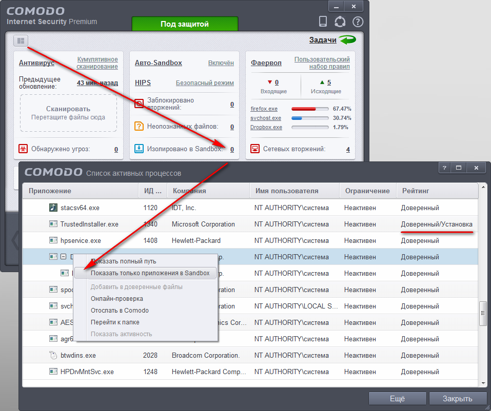 Тот факт, что приложение считается инсталлятором, никак не отражается в окне настройки рейтинга файлов. Лишь после запуска приложения можно будет увидеть в списке активных процессов соответствующую отметку в столбце «Рейтинг». Для открытия этого списка следует нажать на индикатор «Изолировано в Sandbox», вызвать контекстное меню и отключить опцию «Показывать только приложения в Sandbox».