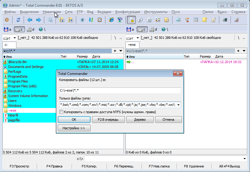Чтобы скопировать исполняемые файлы во временный каталог, можно запустить от администратора какой-либо файловый менеджер наподобие «Total Commander» и выполнить копирование со следующим фильтром: