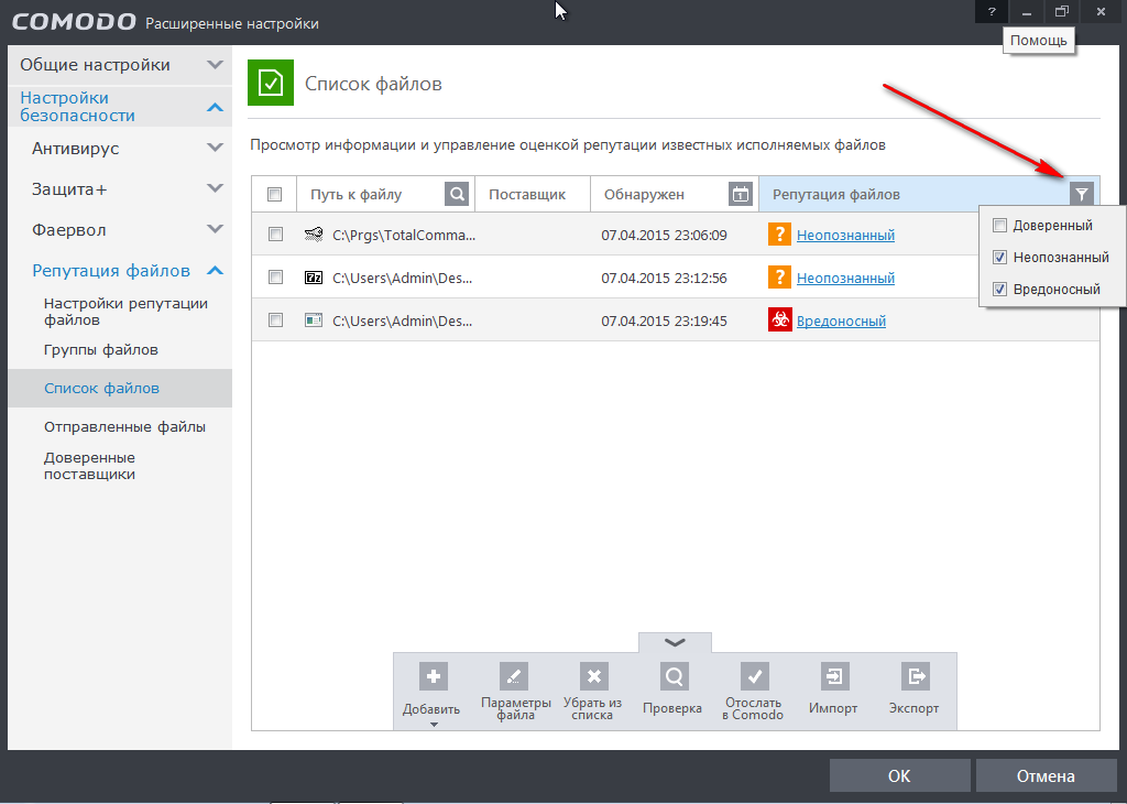 - изменением рейтинга файла, находящегося в списке, на «Доверенный»,