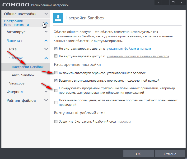 Во-вторых, чтобы неопознанные программы изолировались в Auto-Sandbox, даже когда их запускают приложения с привилегиями установщика, следует отключить опцию «Обнаруживать программы, требующие повышенных привилегий» на вкладке «Защита+» > «Sandbox» > «Настройка Sandbox».
