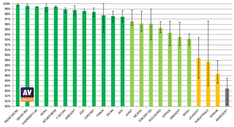 Примечание: Бесплатный антивирус Microsoft Security Essentials не участвует в общем сравнении, выступая в качестве сравнительного эталона.