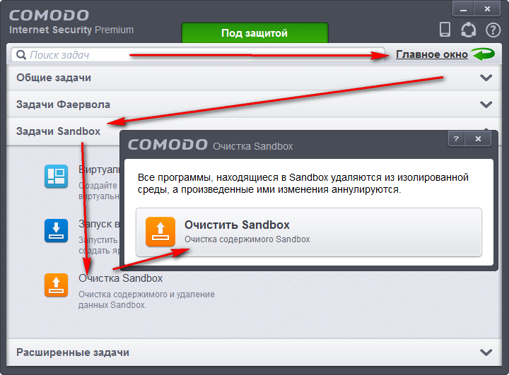 Чтобы завершить все виртуальные процессы и удалить все данные из виртуальной среды, следует нажать кнопку «Очистка Sandbox» (главное окно > «Задачи» > «Задачи Sandbox»). Для удобства эту кнопку можно добавить в виджет и на панель главного окна (через контекстное меню). Также напомню, что окно очистки песочницы можно вызвать командой: