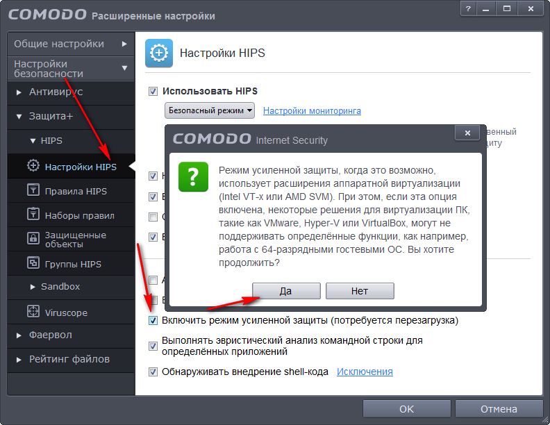 В версии CIS 8 введена поддержка аппаратной виртуализации, ее использование включается опцией «Включить режим усиленной защиты» на вкладке «HIPS» > «Настройка HIPS». Кроме аппаратной виртуализации, данная опция активирует дополнительные меры по предотвращению обхода защиты в 64-битных версиях Windows, поэтому ее включение необходимо в таких системах. Однако перед ее включением появляется также предупреждение о возможном конфликте с виртуальными машинами при работе в них с 64-битными гостевыми системами. Впрочем, на практике я пока не обнаружил конфликтов с VMware.