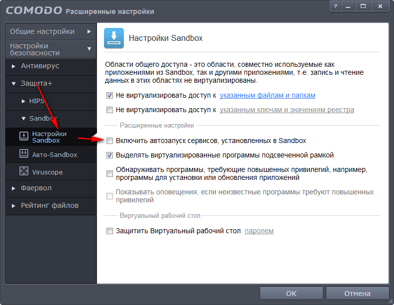 Опция «Включить автозапуск сервисов, установленных в Sandbox» на вкладке «Sandbox» > «Настройка Sandbox» имеет следующий смысл: если в виртуальной среде создать службу, то при каждом использовании виртуальной среды эта служба будет запускаться. Если лишь перезагрузить компьютер — автозапуск службы не произойдет. Но если запустить какую-либо программу в виртуальной среде, то вместе с ней запустится и эта служба. Так запускаться будут программы, установленные именно как службы, а не добавленные в автозагрузку иными способами. При очистке виртуальной среды эти службы, естественно, удаляются. Если нет необходимости в данной опции, рекомендую ее отключить. Ее отключение сменит тип запуска службы «Comodo Virtual Service Manager» с автоматического на ручной.