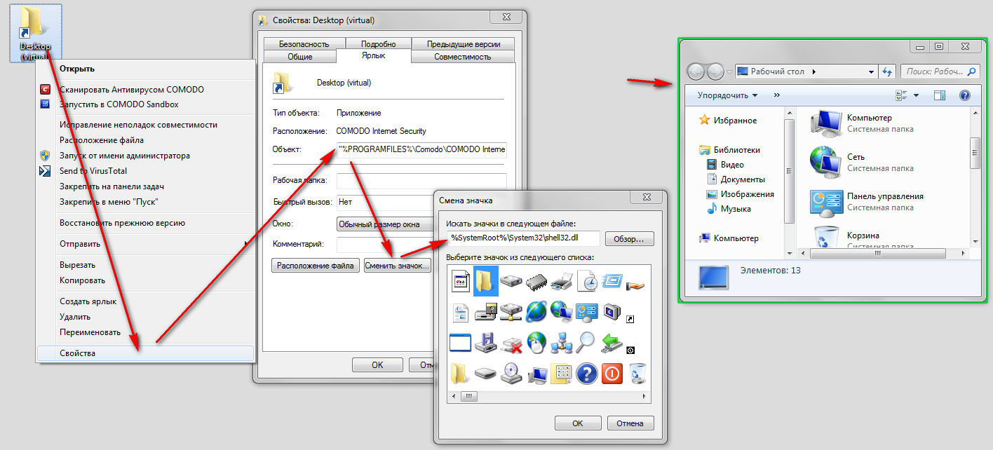 Зададим этому ярлыку желаемый значок и назовем, например, «Desktop (virtual)». Теперь этот ярлык будет запускать в виртуальной среде проводник с открытым в нем рабочим столом.