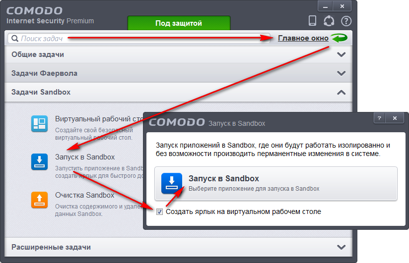 На «обратной стороне» главного окна CIS имеется кнопка «Запуск в Sandbox». Этой кнопкой можно также создать ярлык для запуска какого-либо приложения в виртуальной среде.