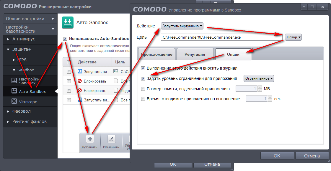Существует возможность запускать программы не только в виртуальной среде, но и с дополнительными ограничениями. Для этого следует включить Auto-Sandbox и создать правило, предписывающее целевому приложению запускаться виртуально, при этом задав на вкладке «Опции» уровень ограничений. Данные ограничения наследуются дочерними процессами. Например, если задать файловому менеджеру FreeCommander уровень «Ограниченное», то он и запущенные из него программы будут работать в виртуальной среде и не получат доступа к буферу обмена. Также можно ограничить время выполнения этих программ и выделяемую им память.