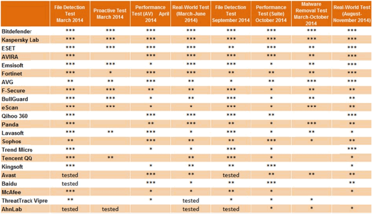 Лучшими антивирусами 2014 года по версии AV-Comparatives стали продукты (в алфавитном порядке) AVG, AVIRA, Emsisoft, ESET, F-Secure, Fortinet, Kaspersky Lab.
