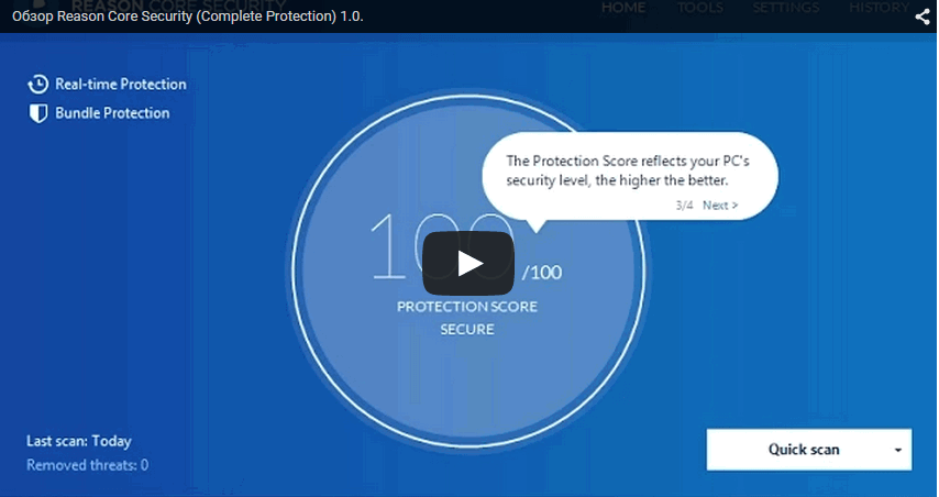 Reason Core Security - облачное решение безопасности. Версия Complete Protection предлагает защиту в реальном времени от вредоносных программ, ПНП, рекламного и шпионского ПО. Работает совместно с другими антивирусами, обнаруживая пропущенные угрозы.