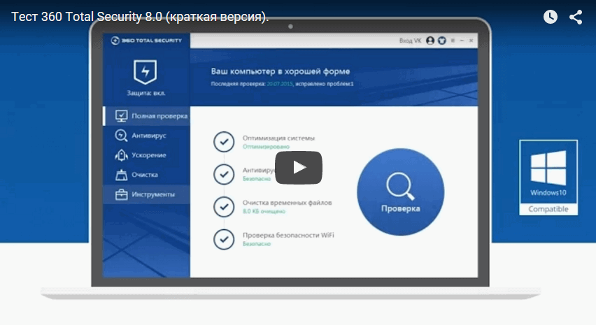 В тестировании принимала участие версия 360 Total Security 8.0.0.1058.
