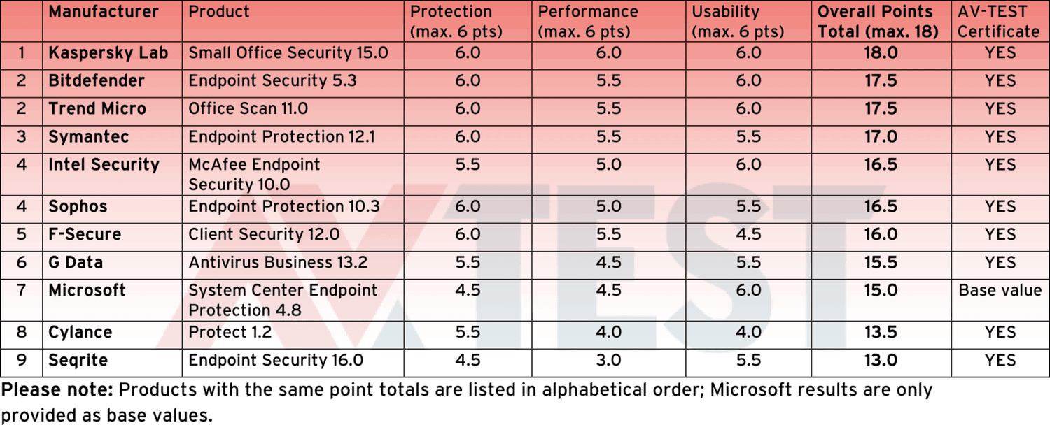 Лаборатория AV-Test протестировала 11 антивирусов по критериям оценки: защита, производительность и юзабилити. Во всех трех категориях, лаборатория могла присвоить до 6 баллов каждому продукту, т.е. максимально возможный суммарный результат равен 18 баллам. В тесте только продукт Kaspersky Small Office Security смог показать наивысший результат. Очень близко расположись антивирусы от Bitdefender, Trend Micro и Symantec, которые получили от 17 до 17,5 баллов.