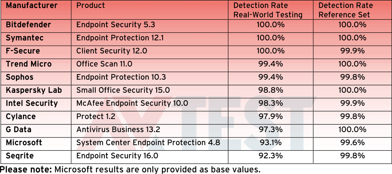 Лаборатория оценивала эффективность защиты с помощью внушительной коллекции из 15000 вредоносных образцов. Испытание проходило в два этапа. Во время первого этапа использовались новейшие вредоносные угрозы нулевого дня из сети и вложений электронной почты. На втором этапе обнаружения использовались известные зловреды. Наилучшие показатели в данном испытании продемонстрировали Bitdefender и Symantec. Они обнаружили 100 процентов угроз в обоих фазах тестирования. Client Security от F-Secure не смог распознать один старый образец и таким образом отметился 99,9 процентным уровнем обнаружения. Лаборатория присвоила данным решениям максимальные 6 баллов Продукт Microsoft получил 4,5 балла и обнаружил 93,1 и 99,6 процентов угроз. Только Seqrite не смог превзойти номинальное значение и распознал заметно меньше угроз, чем Microsoft.
